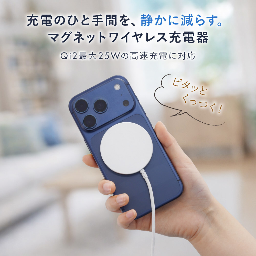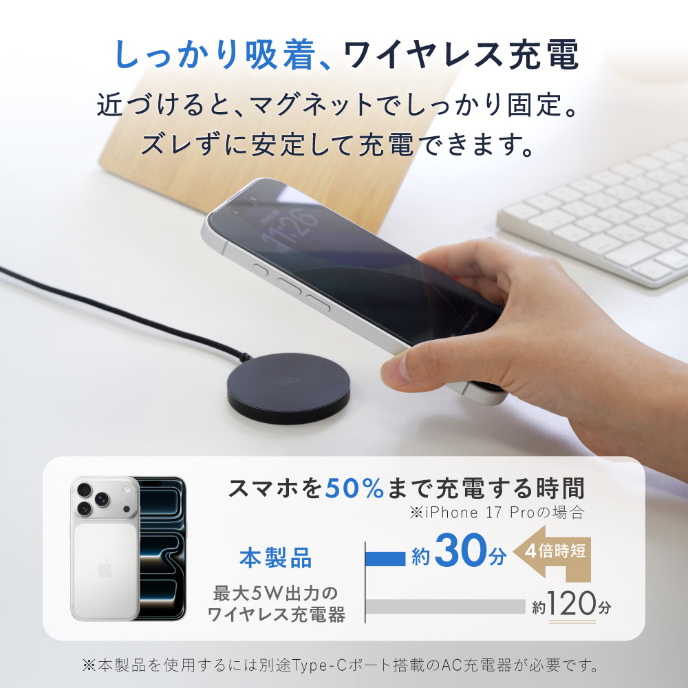 iOS26以降のiPhone 16、iPhone 17シリーズなどで最大25Wの高速なワイヤレス充電が可能です。