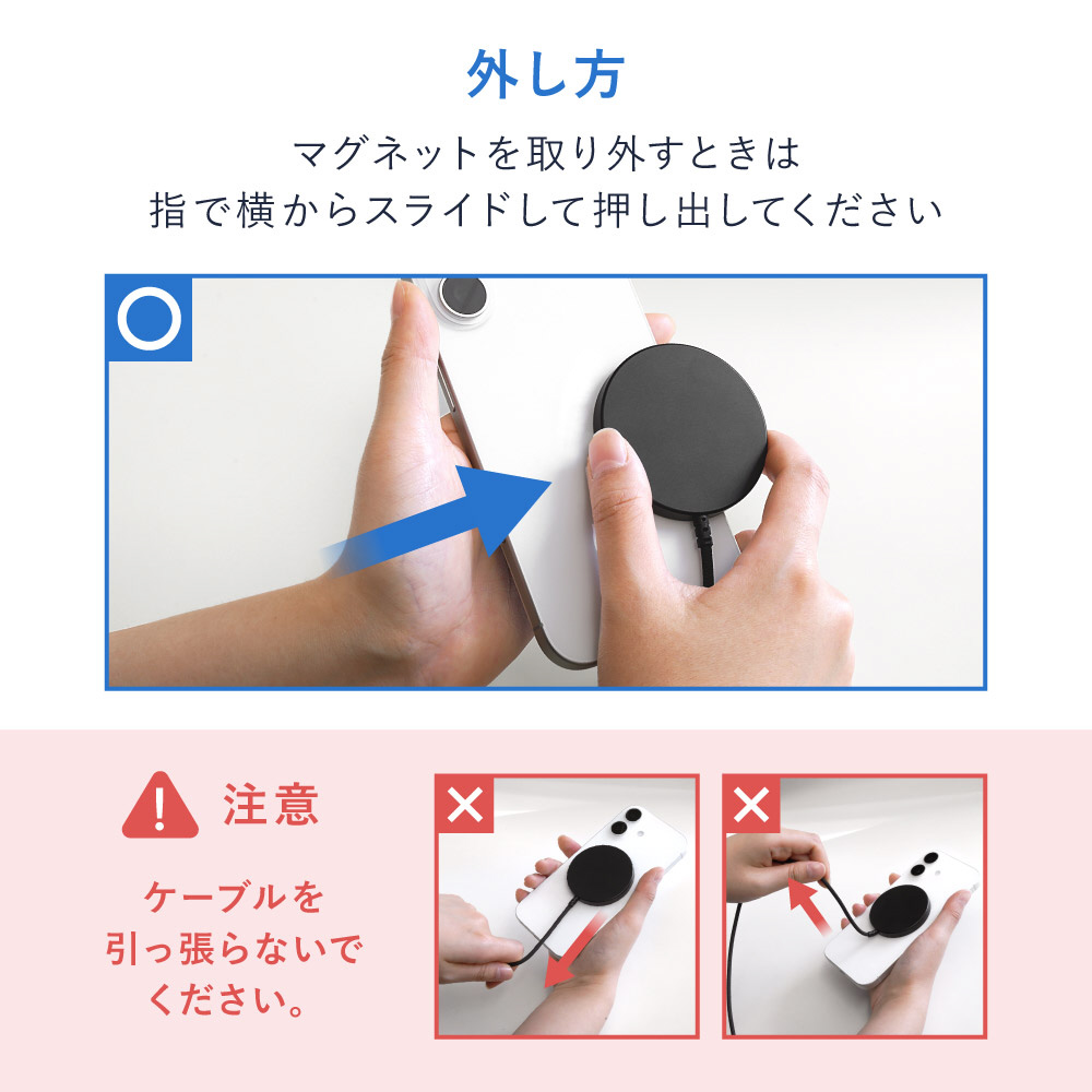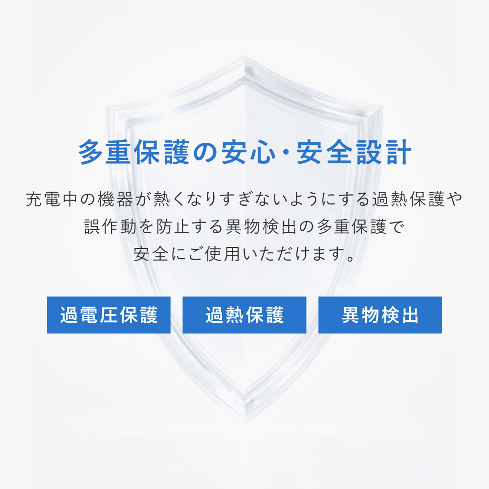 ワイヤレス充電時の「過電圧保護」に加えて、充電中の機器が熱くなりすぎないようにする「過熱保護」や、誤作動を防止する「異物検出」の多重保護で安全にご使用いただけます。