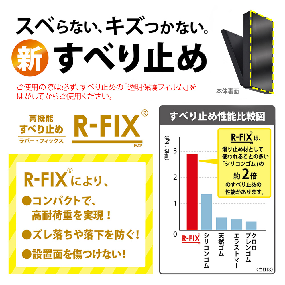●ズレ落ちにくいすべり止めシート「R-FIX」が本体のコンパクト化と高耐荷重を実現。