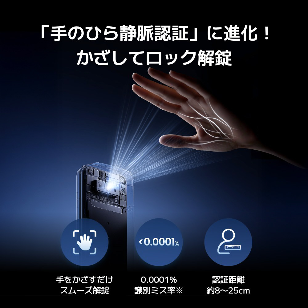 ・iPhoneと同じ3D顔認証で1秒以内のスピード解錠 ・静脈解錠機能付き、手をかざすだけで家族みんなにやさしい ・3Mテープで貼り付けるだけで、配線や工事は不要 ・1度の充電で1年間使用可能*。モバイルバッテリーを挿し込んでの充電や、ソーラーパネル(別売)での給電も ・パスワードや指紋認証はもちろん、交通系ICからもスムーズに解錠 *解錠・施錠を1日に各10回ずつ行なった場合