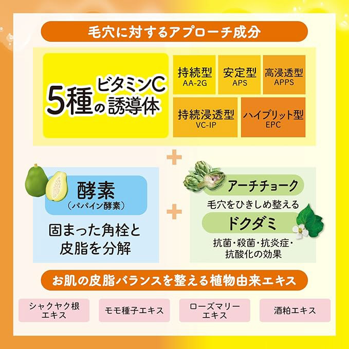 5種のビタミンC誘導体で、毛穴をひきしめ、整える。ボタニカルアロマの香り。