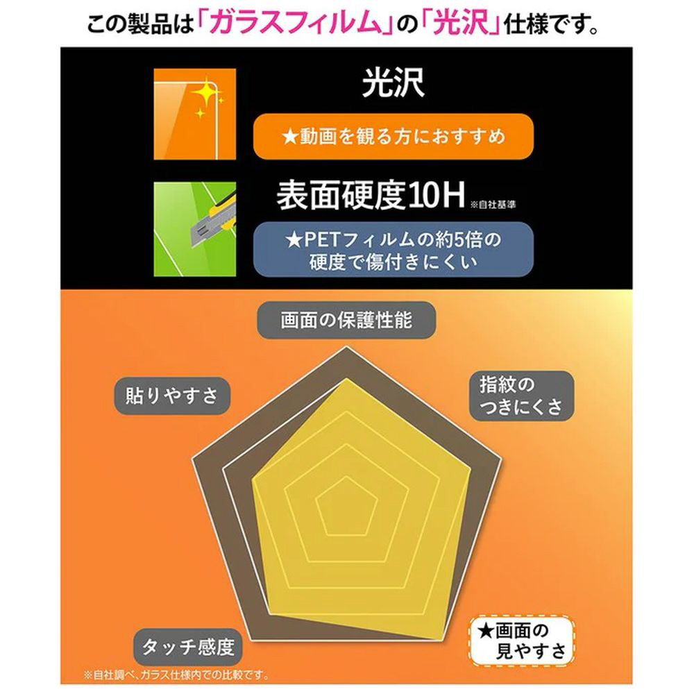 ガラスの表面は高い透明感のある光沢仕様で、画面本来の美しさをそのまま楽しめます。