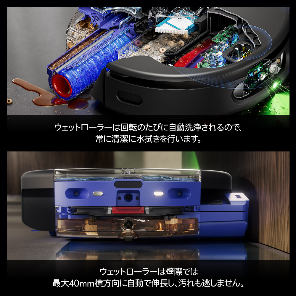 掃除中も常に自動洗浄されるウェットローラーで、清潔に水拭き。