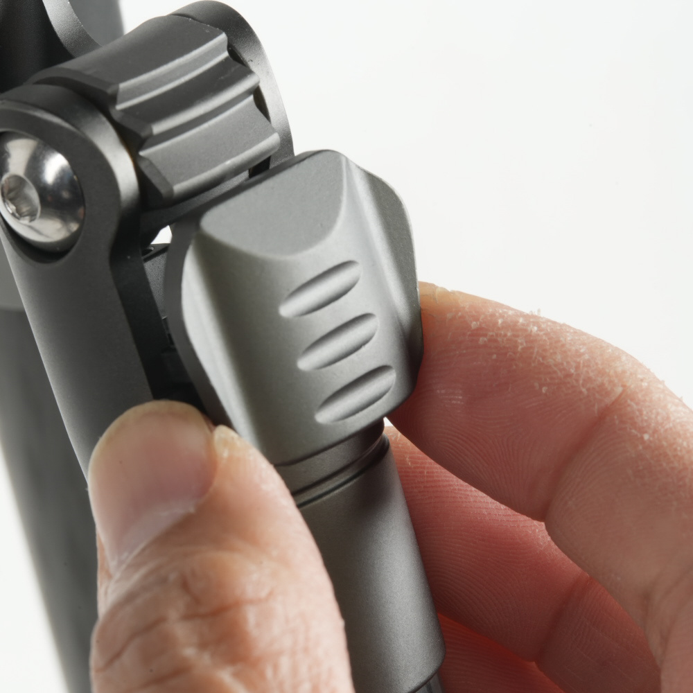 三脚の脚3本とエレベーターを支える、三脚の「本体」には、アルミ削り出しのパーツを採用。肉抜きにより、さらなる軽量化を実現しました。