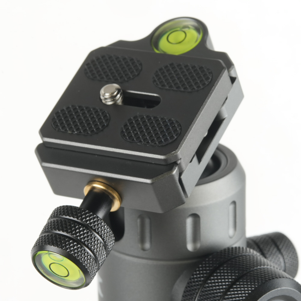 セット販売用の自由雲台には、水平時用の1軸水準器に加え、縦位置での水平確認用に、シューのクランプノブにも、水準器を装備。
