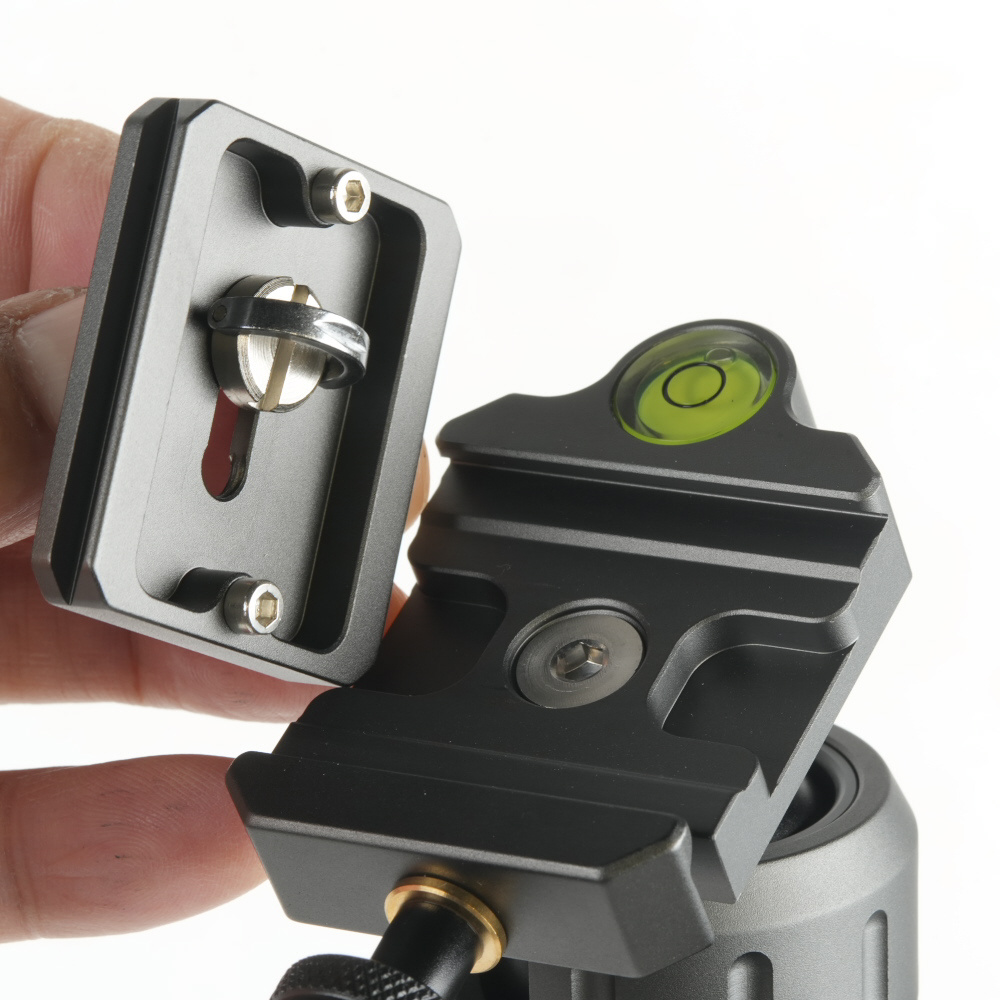 汎用性の高い、アルカスイス互換のクイックシューによる取り付け方式を採用。また、付属のクイックシューのカメラネジは蝶ネジ付きで、工具やコインがなくても、すぐにカメラを取り付けできます。
