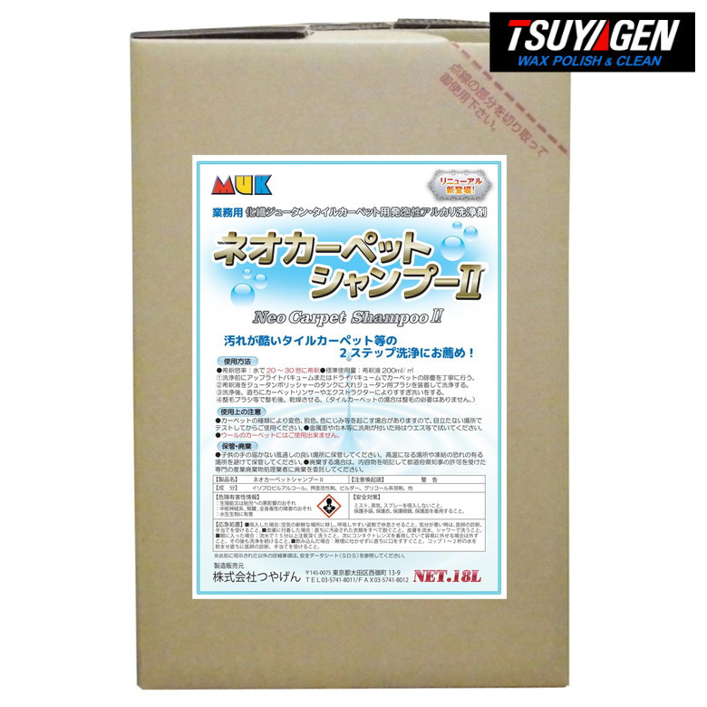 ●特殊界面活性剤の配合により高い洗浄力を発揮し、重度の汚染(獣道)に対して効果的に汚れを落とします。●再汚染防止効果があり、カーペットの美観を長時間維持します。●高発泡タイプですが泡切れが良く、2ステップ方式の洗浄に最適な作業性です。●用途:タイルカーペット、化繊ジュータン、マット等の洗浄用。●希釈倍率:汚れの程度に応じて20~30倍に水で希釈。●1.アップライトバキューム等でカーペットを丁寧に除塵します。●2.希釈した本製品をポリッシャータンクに入れて洗剤を出しながらブラシで洗浄します。●3.カーペットリンサーを使用して濯ぎながら汚水を回収します。乾燥を待ち終了。●シルク、ウールのカーペットにはご使用できません。【成分】●イソプロピルアルコール、グリコール系溶剤、陰イオン界面活性剤、無機ビルダー、キレート剤、特殊ポリマー、防腐剤、香料、染料、他(弱アルカリ性)