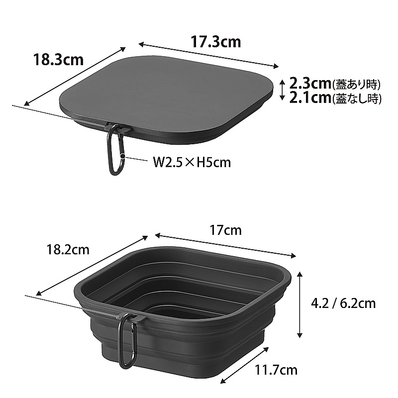 仕様1 サイズ:(約)W17.3×D18.3×H2.3cm、使用時=W17×D18.2×H4.2/6.2cm ●重量:(約)190g ●容量:H4.2cm=700ml、H6.2cm=1000ml ●材質:本体=シリコーンゴム(芯材=ナイロン)、蓋=ポリプロピレン