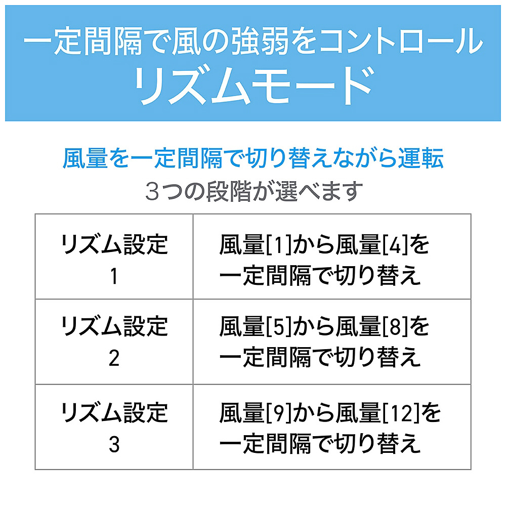 風量12段階、自動首振り左右70度、リズムモード