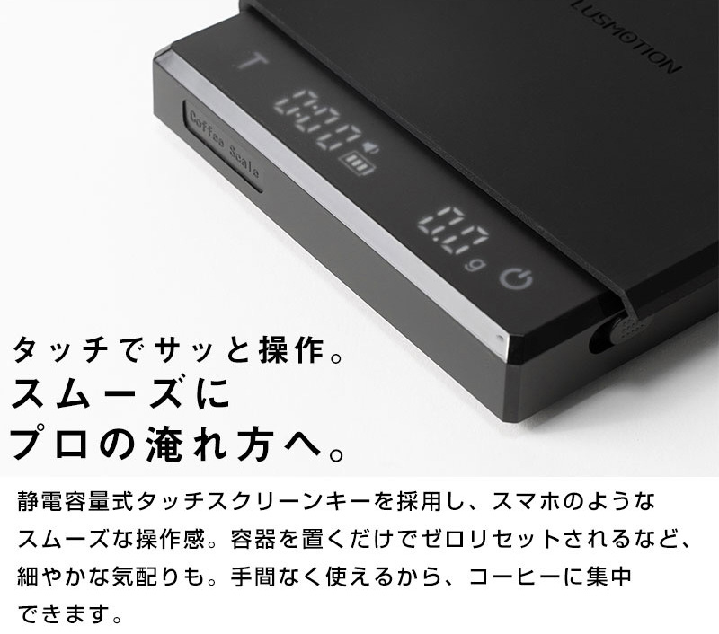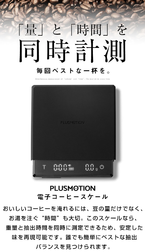 「PLUSMOTIONデジタルコーヒースケール」は、抽出量と時間を同時に計測できるコーヒー専用スケールです。
