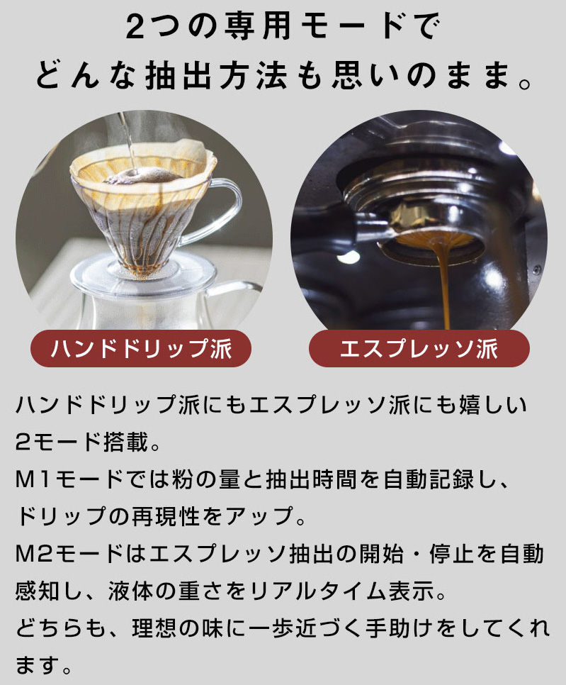 ・エスプレッソモード:小容量の正確な計測に対応。0.1g刻みの精度でショットを管理できます。