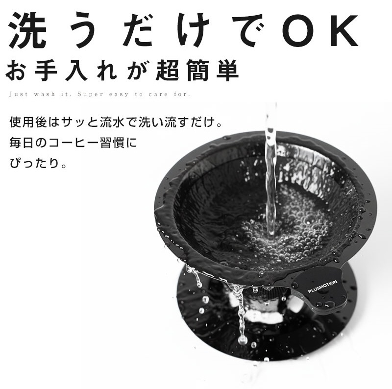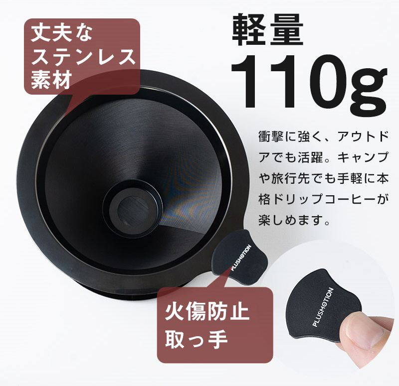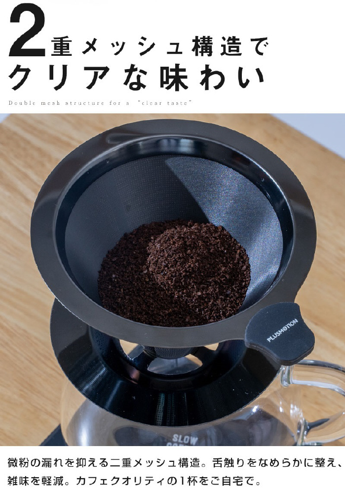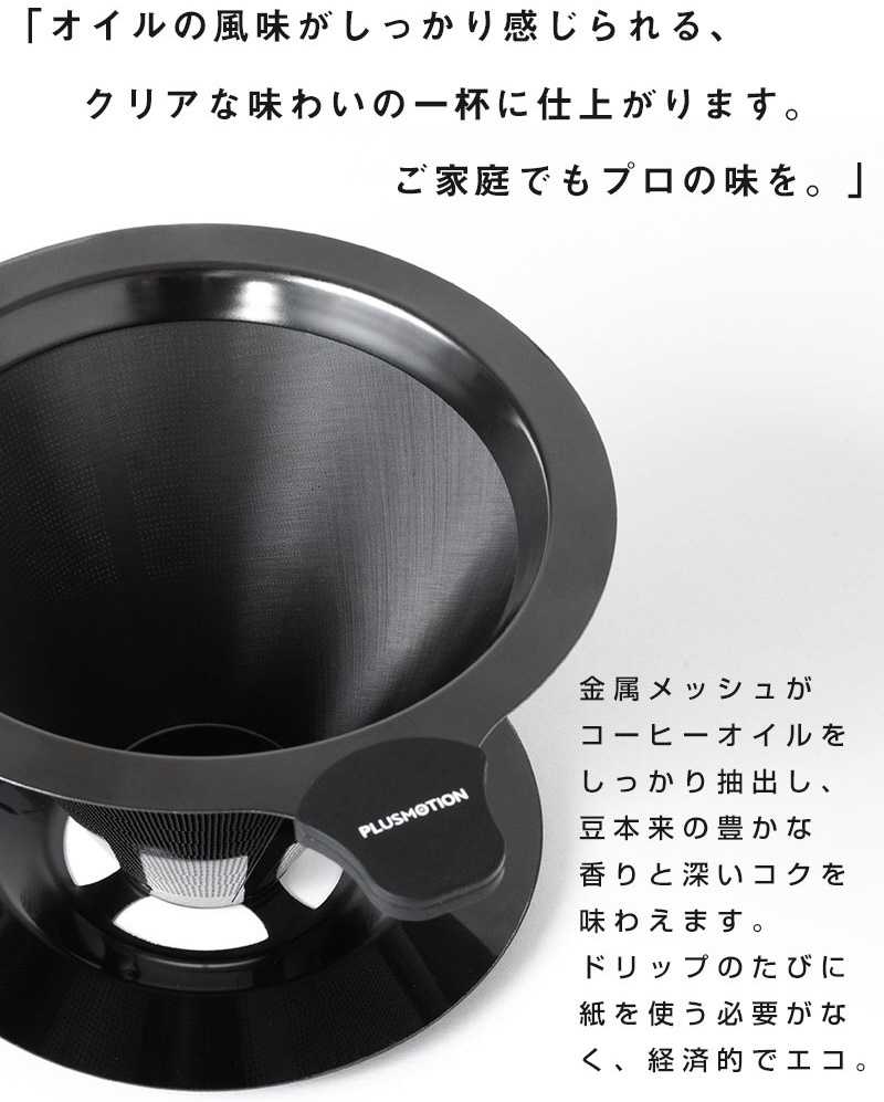「PLUSMOTION ブラックメタルメッシュドリッパー」は、微粉が入りにくく、なめらかでクリアな味わいを引き立てます。
