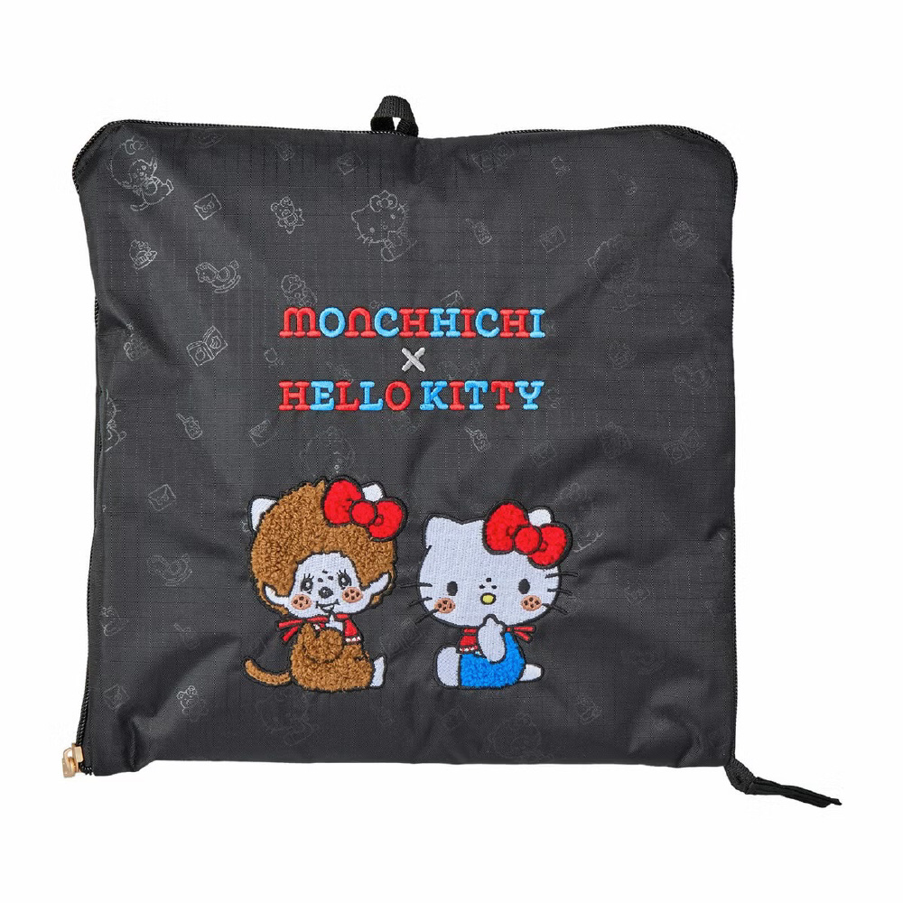 バッグ前面にはモンチッチとハローキティのイラストが、底面(折りたたんだ時は前面になる部分)にもモンチッチとハローキティのイラストとMONCHHICHI×HELLO KITTYのロゴが刺繍されています。内装生地はベージュのギンガムチェックにモンチッチとハローキティのイラストの総柄。