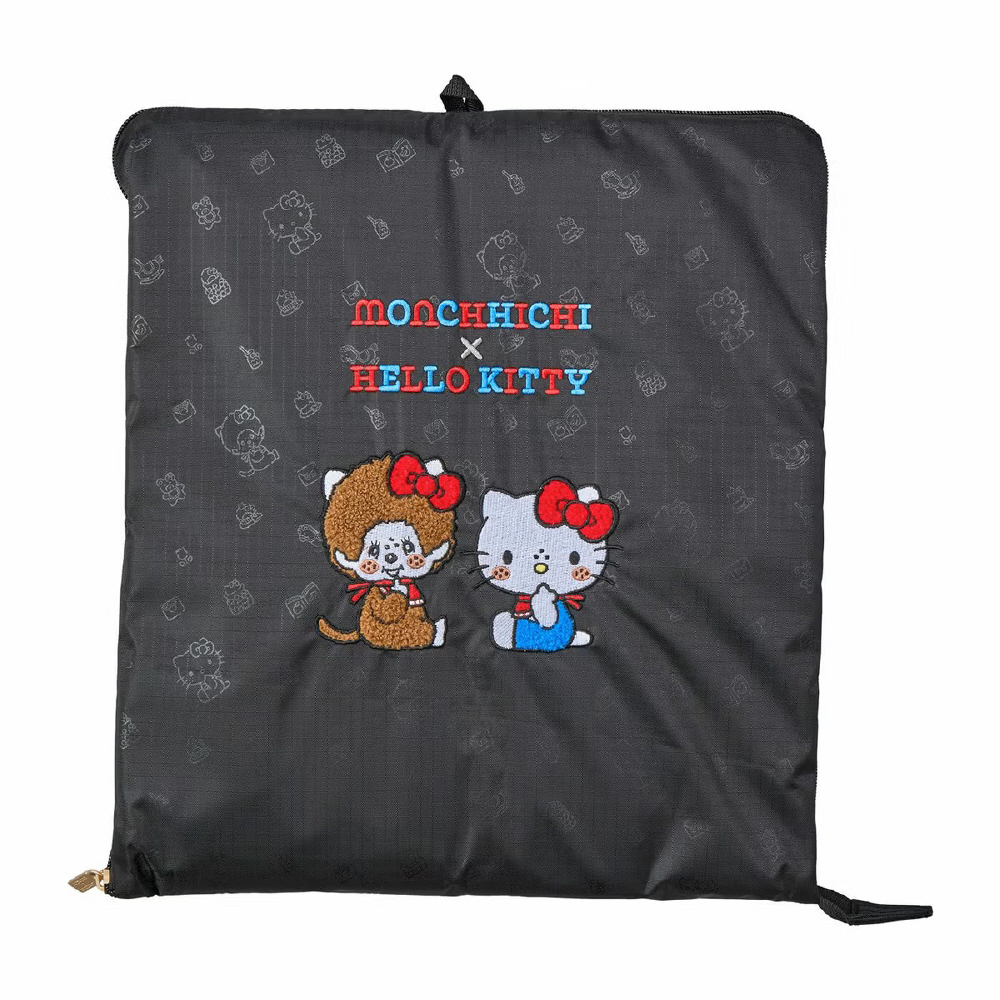 バッグ前面にはモンチッチとハローキティのイラストが、底面(折りたたんだ時は前面になる部分)にもモンチッチとハローキティのイラストとMONCHHICHI×HELLO KITTYのロゴが刺繍されています。内装生地はベージュのギンガムチェックにモンチッチとハローキティのイラストの総柄。