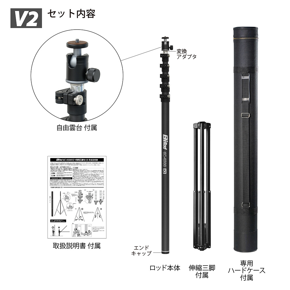 ハイアングル撮影用一脚[Bi Rod(ビーアイロッド) 6C-4500V2]+専用三脚セット [4.5m / 6段 / カーボン] Bi Rod G80308
