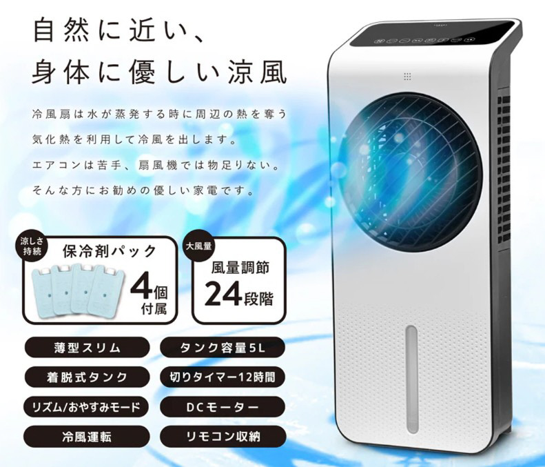 自然に近い、身体に優しい涼風 DCモーターの静音・省エネの薄型スリム冷風扇 風量24段階調節