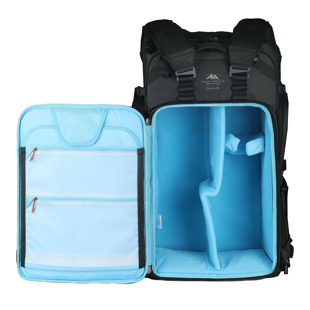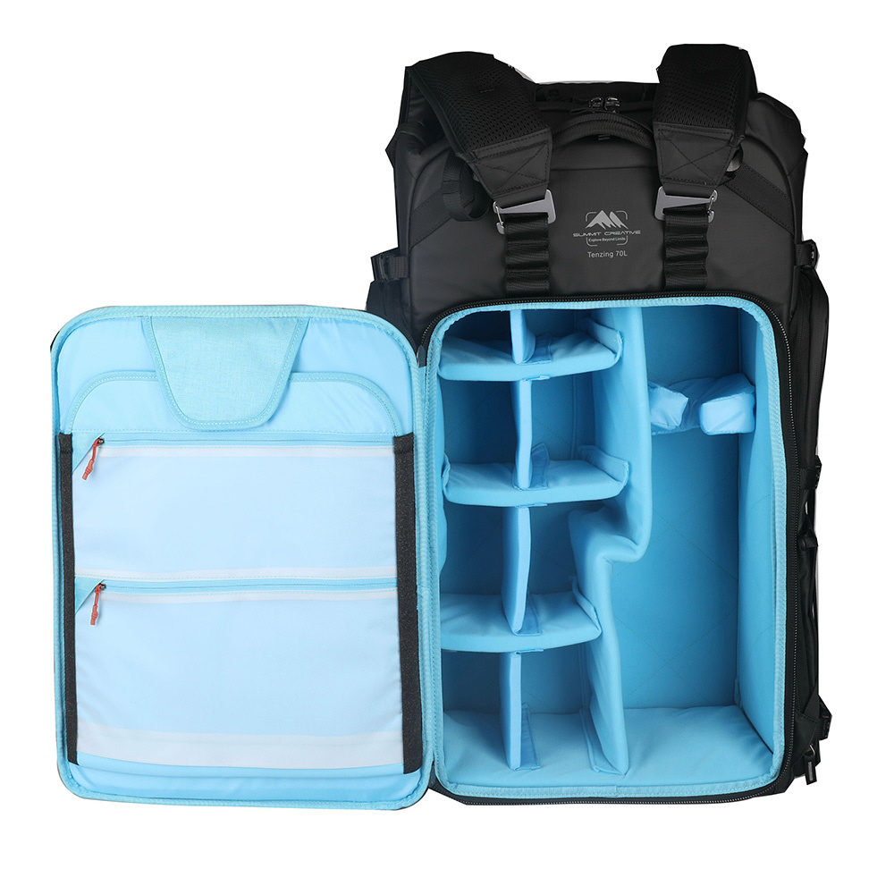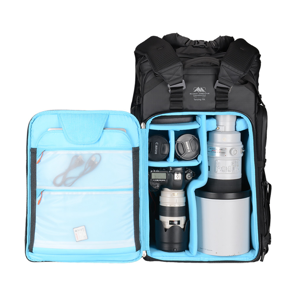 超望遠レンズや、大量の機材を確実かつ快適に運搬可能な大容量70Lリットル