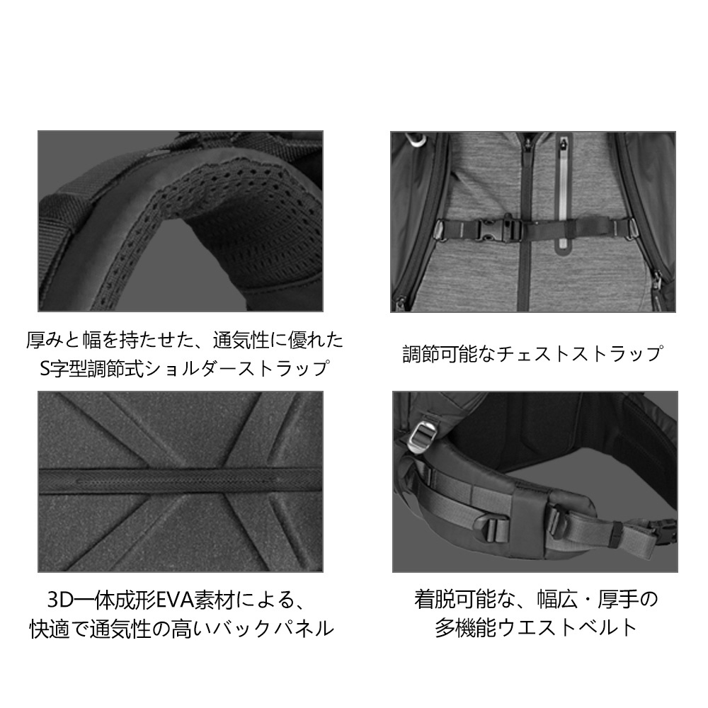 快適で通気性のある一体型のバックパッドは、調節可能なショルダーストラップ、チェストストラップ、ウエストベルトを組み合わせることで、通気性を保証します。