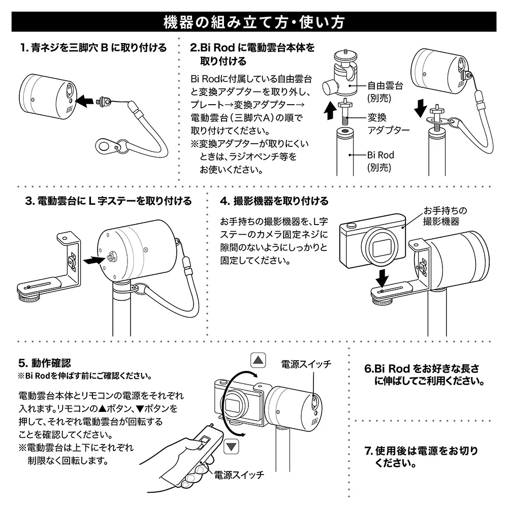 ワンタッチで画角自在!リモコン操作でカメラを上下(チルト)・左右(パン)に動かせる電動雲台。Bi Rodを伸ばしたまま、手元から思い通りのアングルに調整可能です。※動作可能な方向は「上下(チルト)」または「左右(パン)」のいずれか一方向のみとなります。
