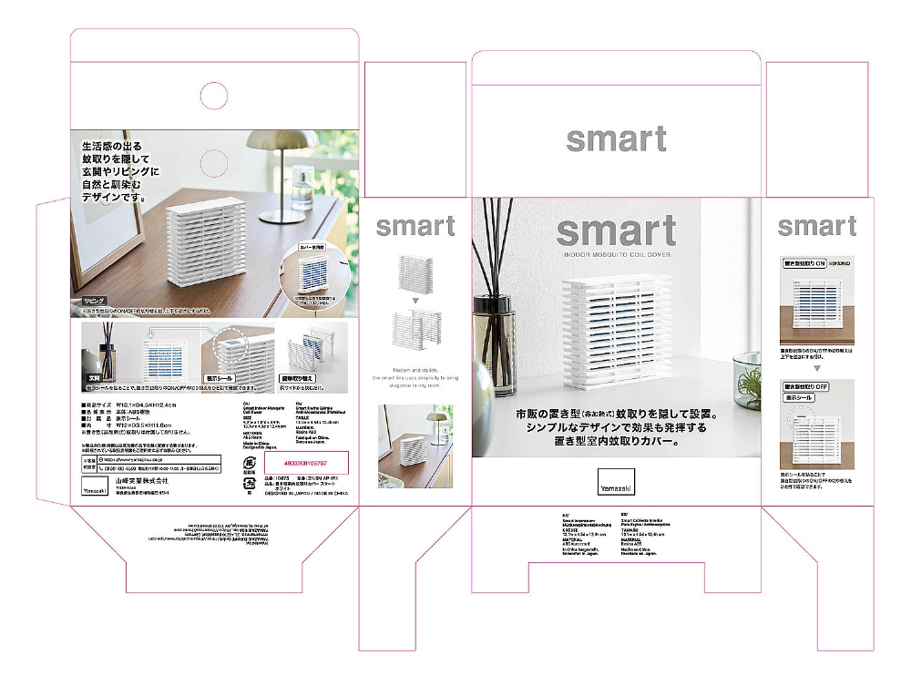 市販の置き型(非加熱式)蚊取りを隠して設置できる、置き型室内蚊取りカバーです。シンプルなデザインで、蚊取りの効果はそのままに、生活感を抑えて玄関やリビングなどの空間に自然と馴染みます。置き型蚊取りを両サイドから挟むだけで簡単に設置可能。上下を逆さにすることでON/OFFを切り替えられ、付属の表示シールを貼ることで、使用状態をひと目で確認できます。