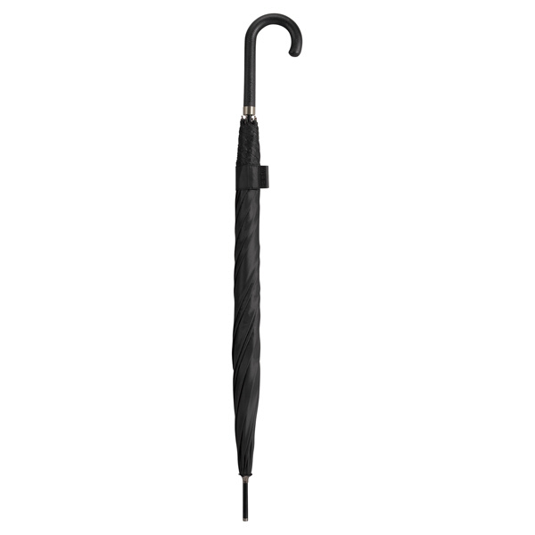 レザー(合皮)の持ち手にエンボス加工を施した、大人向けのシックな長傘。開いたときの直径が約112cmと大きめサイズなので、男性でもしっかりとカバーしてくれるサイズ感。手元はしっとりと手になじむ質感で、握るたびに上品さを感じられます。帯部分にも同じエンボス加工を施し、開く瞬間から閉じる所作まで美しく見せるデザインに仕上げました。