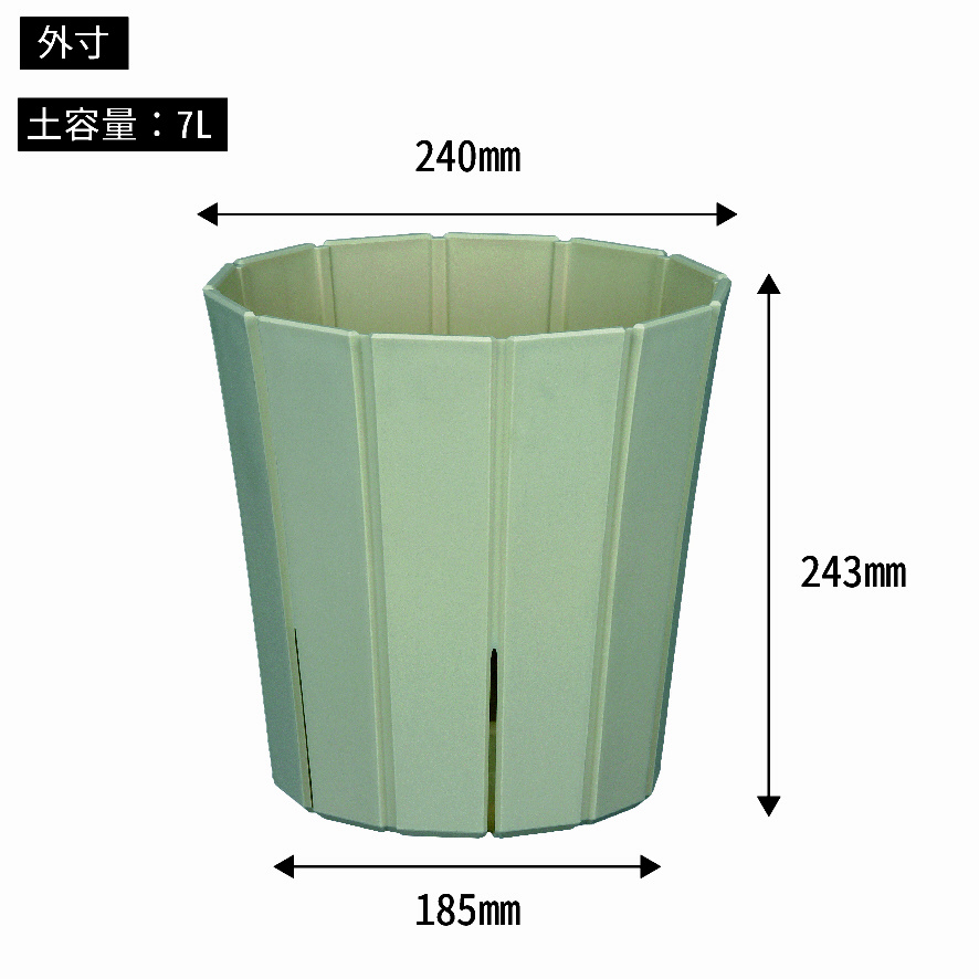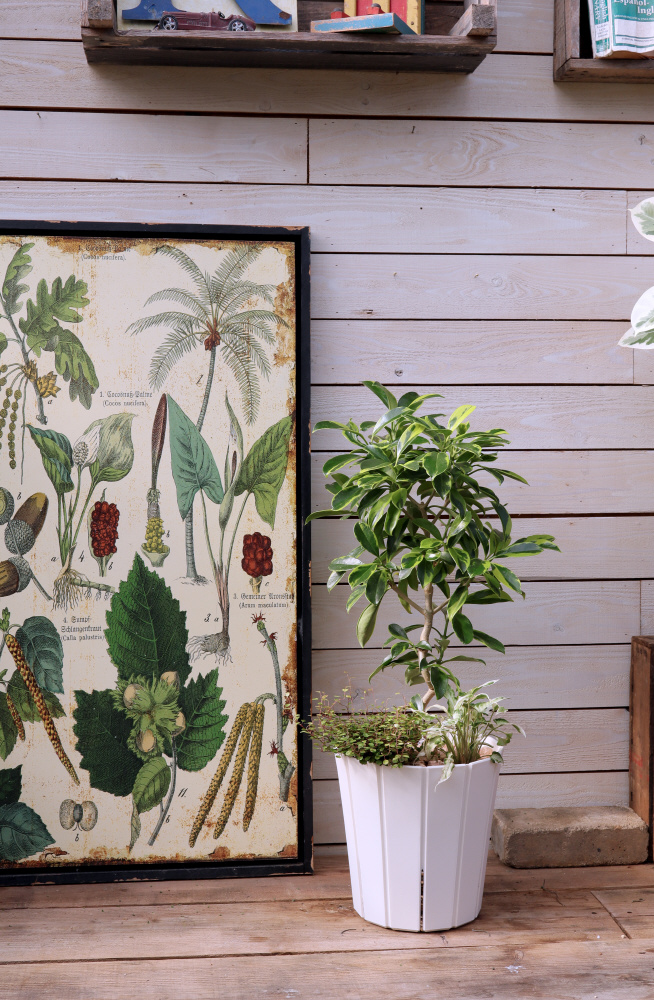 陶器鉢のような手触りとシンプルで安定感のある寸胴型のフォルムで、観葉植物などをすっきりと飾れます