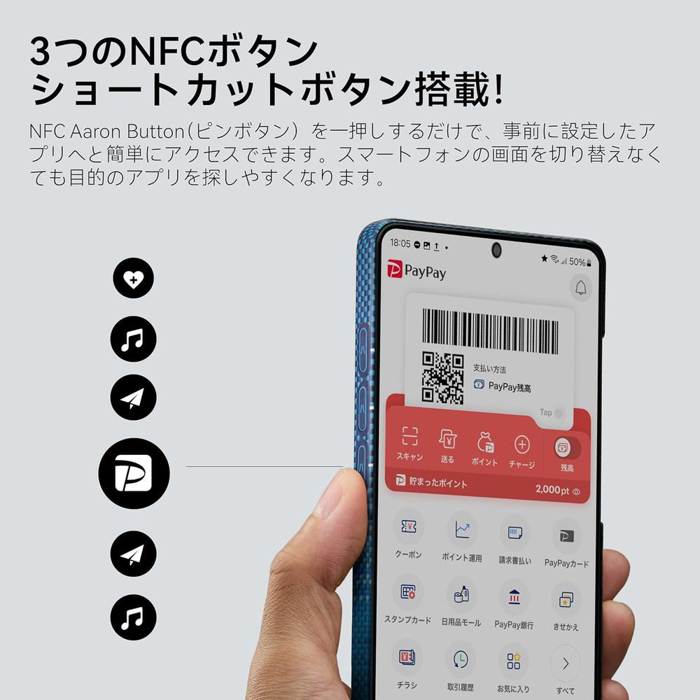 ケース側面に搭載された3つのタッチボタン「Aaron Button(アーロン ボタン)」は、PITAKA独自の画期的システムです。