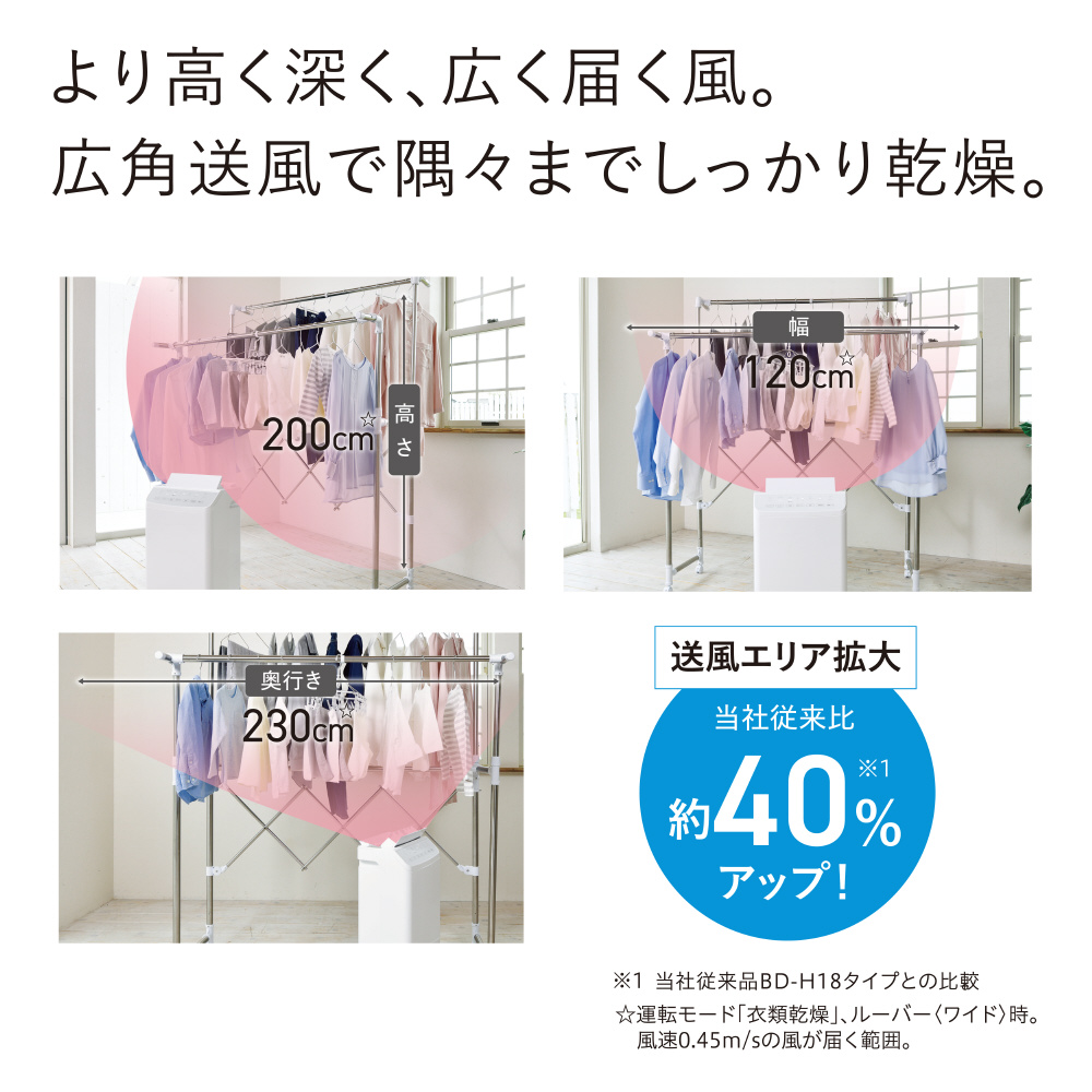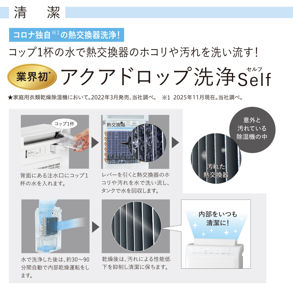 速乾Wルーバーの新気流で衣類乾燥品質がグレードアップ。業界初の熱交換器清潔機能、アクアドロップ洗浄セルフ搭載。