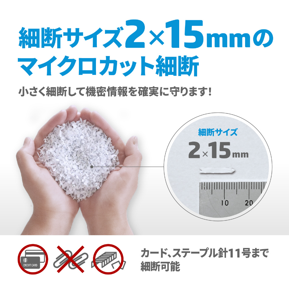 マイクロカット2x1mm 最大細断枚数5枚 定格連続運転時間3分 カード細断可