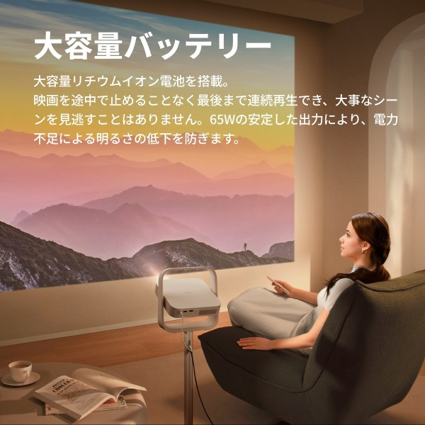 ■ 大容量バッテリー内蔵 高容量リチウムバッテリーを搭載し、 フルレングスの映画も連続再生が可能。 65W給電に対応しており、 バッテリー駆動時でも投影輝度に影響を与えず、 安定した映像体験を維持します。