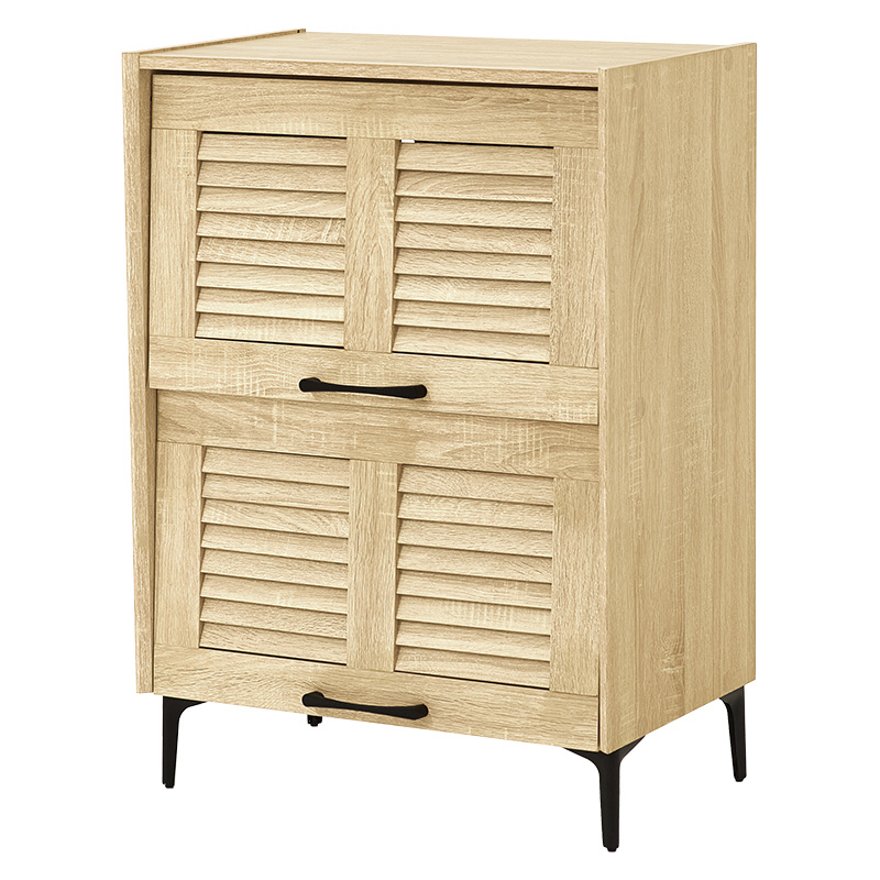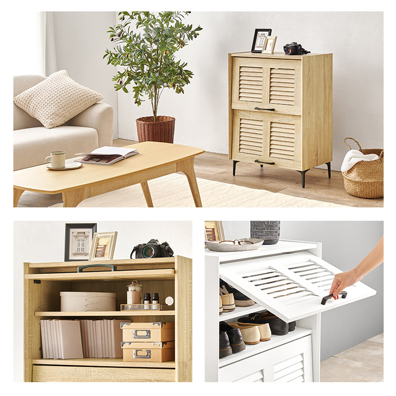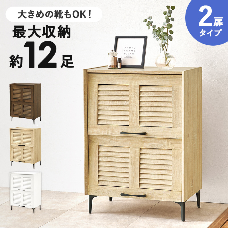 通気性の良いルーバー扉のシューズラック。可動棚付きで大きめの靴も収納でき、スッキリとしたスチール脚はリビングの収納としてもおしゃれに使えます。