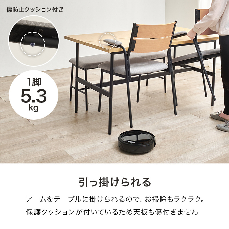 テーブル天板の中央にスリットを入れたスタイリッシュなデザインのダイニング4点セット。チェアはアーム部分をテーブルにかけられるのでお掃除もラクラク。