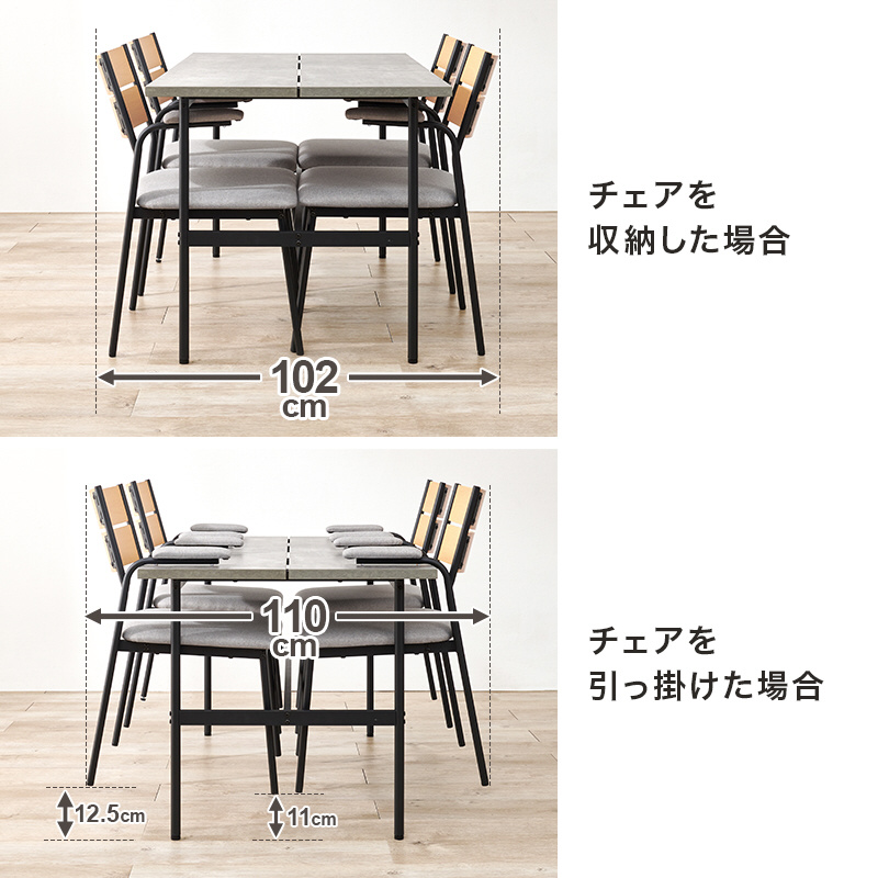 テーブル天板の中央にスリットを入れたスタイリッシュなデザインのダイニング5点セット。チェアはアーム部分をテーブルにかけられるのでお掃除もラクラク。