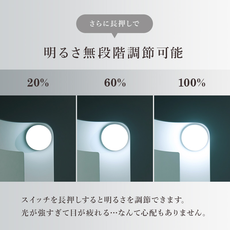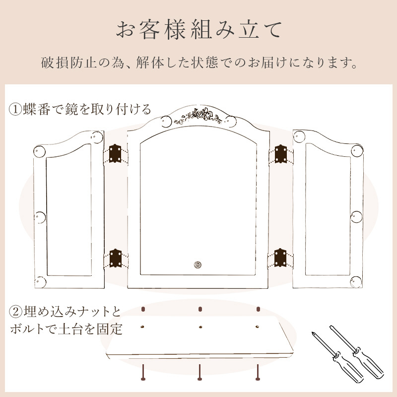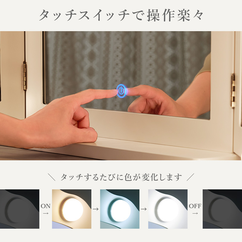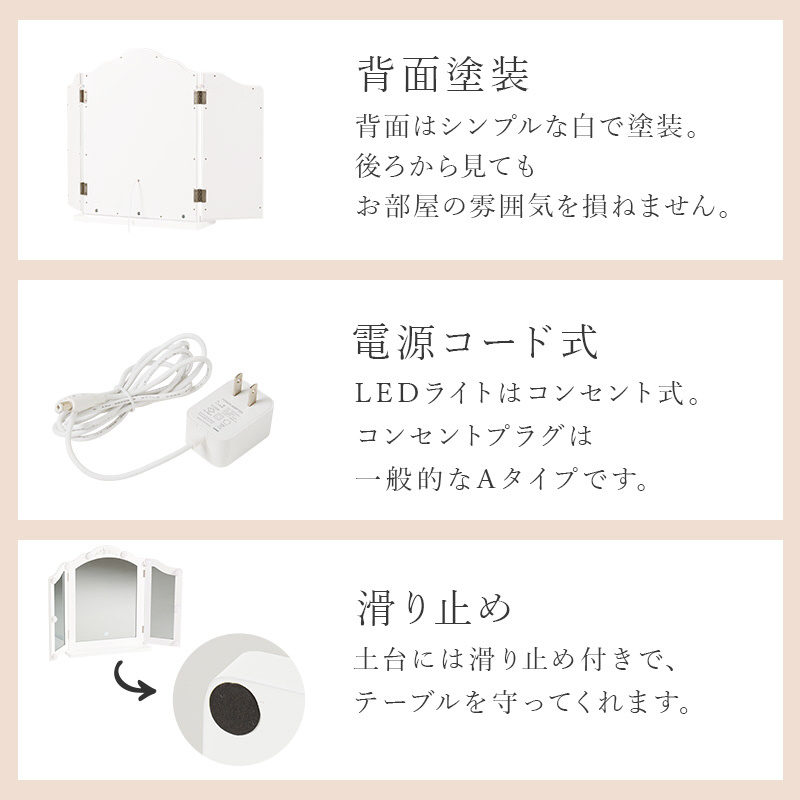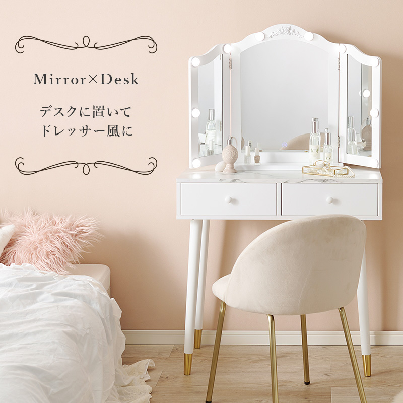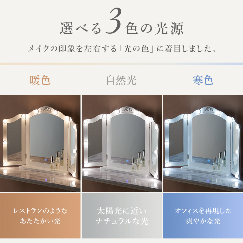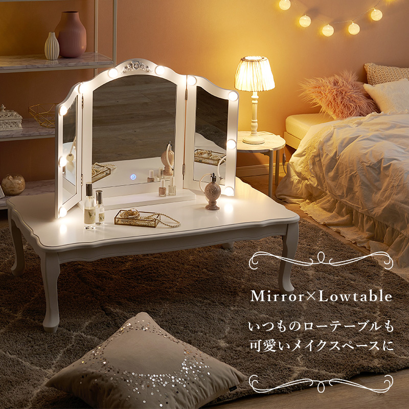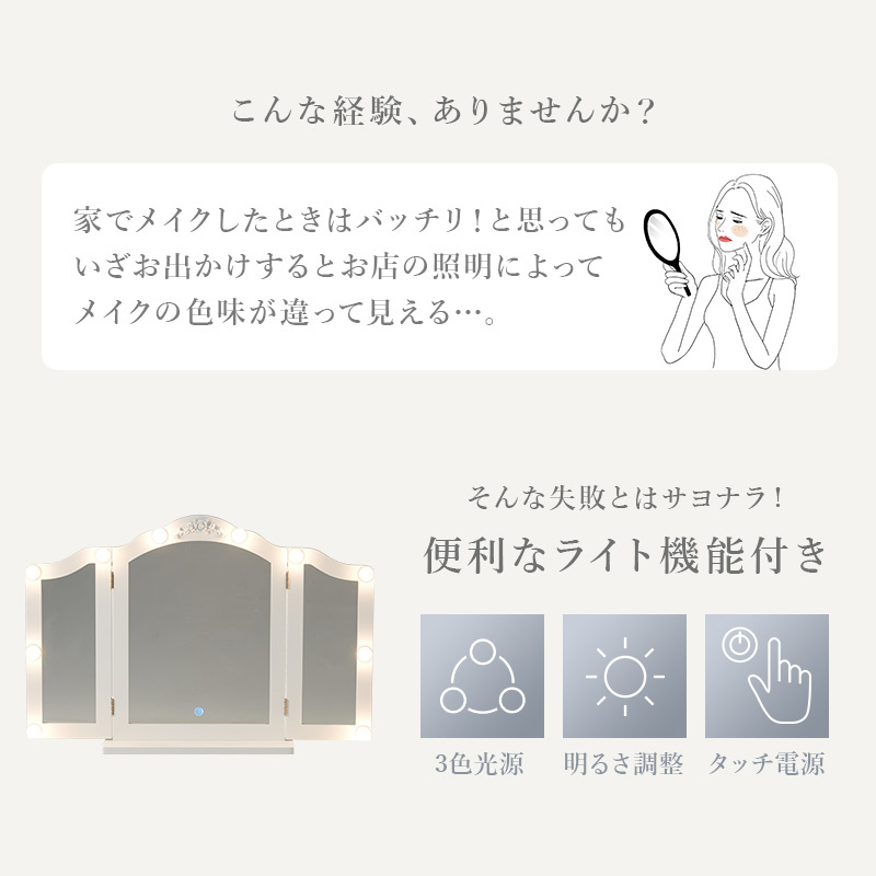 自宅のテーブルに置くだけで、本格的なLEDライト付き三面鏡ドレッサーに。メイクやヘアセットに大活躍。
