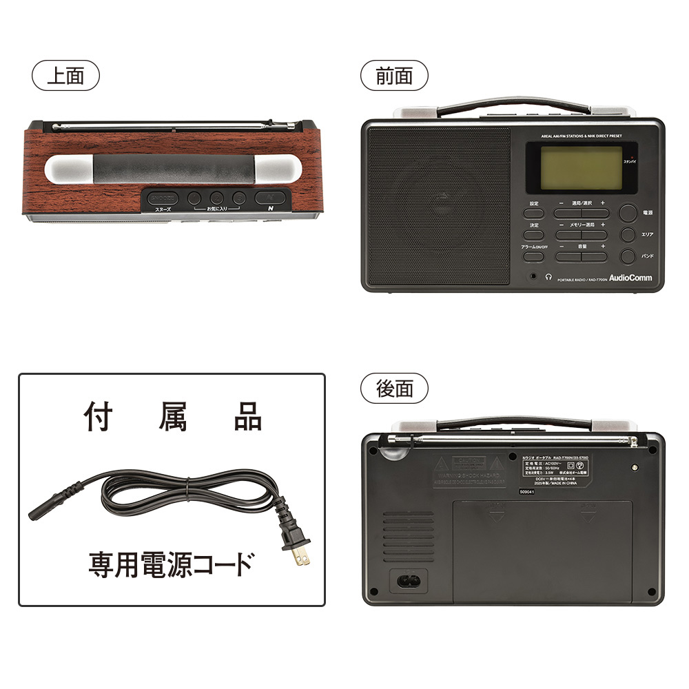 専用電源コード、プリセット済み放送局リスト、保証書、取扱説明書