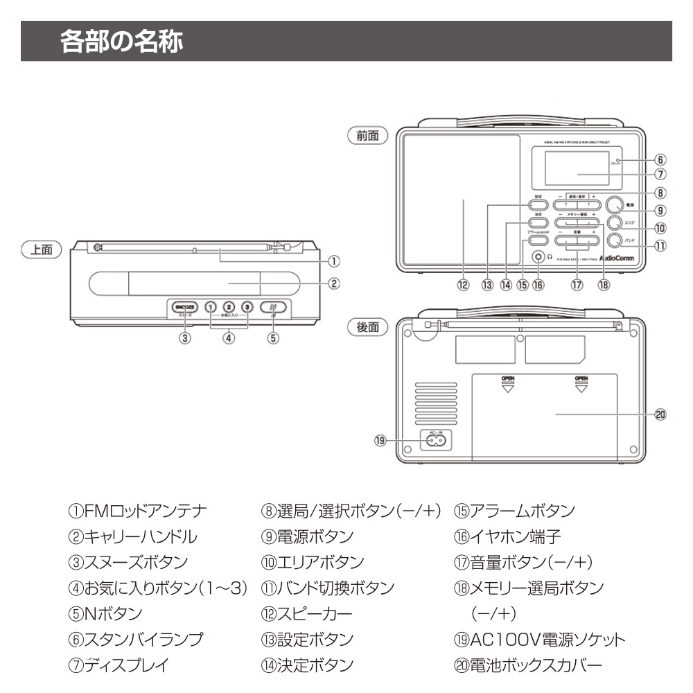 【アンテナ】:AM…内蔵フェライトバーアンテナ、FM…ロッドアンテナ