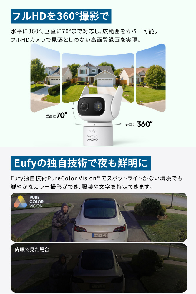 Eufy独自技術PureColor Vision(TM)でスポットライトがない環境でも鮮やかなカラー撮影ができ、服装や文字を特定できます。