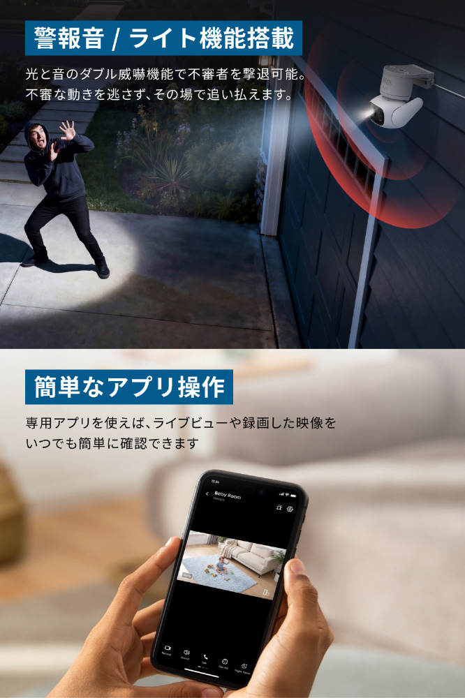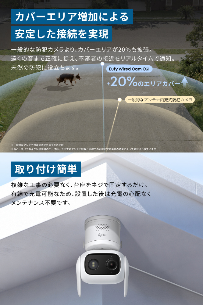 一般的な防犯カメラより、カバーエリアが20%も拡張。遠くの音まで正確に捉え、不審者の接近をリアルタイムで通知。未然の防犯に役立ちます。