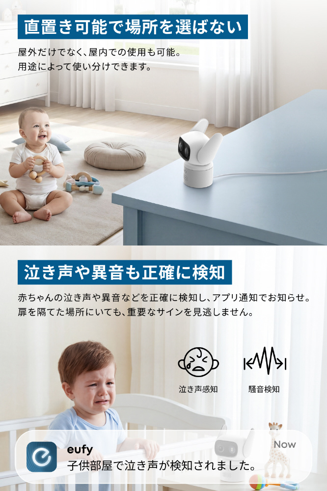 赤ちゃんの泣き声や異音などを正確に検知し、アプリ通知でお知らせ。扉を隔てた場所にいても、重要なサインを見逃しません。