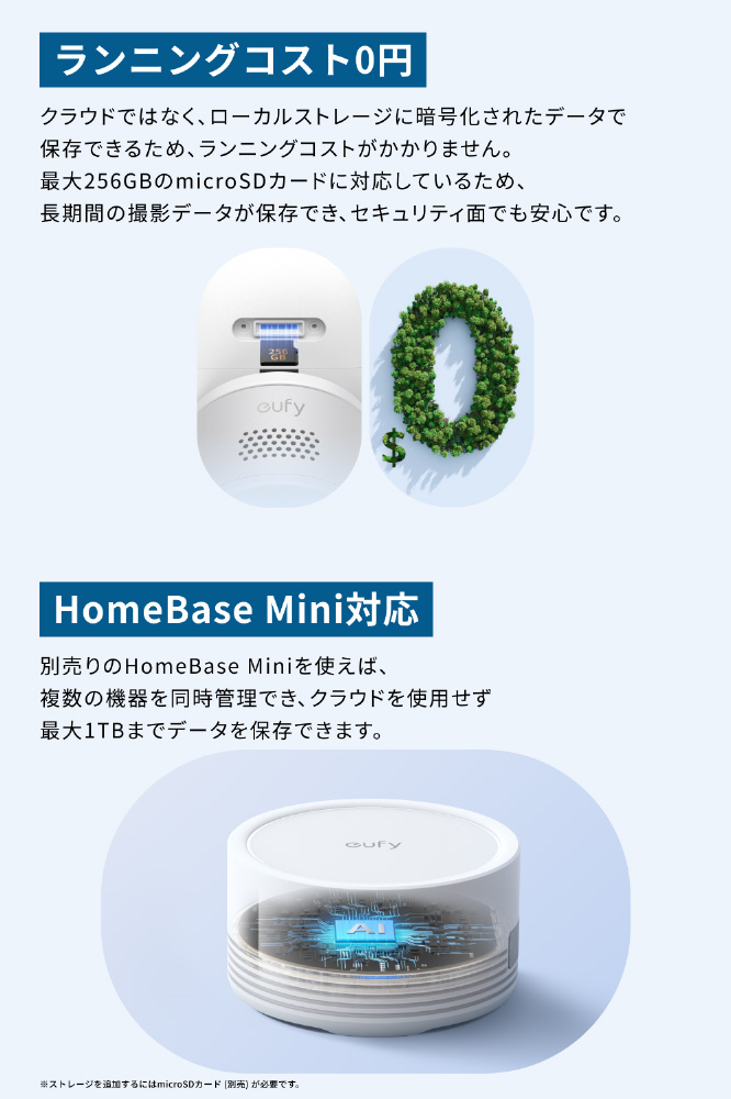 クラウドではなく、ローカルストレージに暗号化されたデータで保存できるため、ランニングコストがかかりません。最大256GBのmicroSDカードに対応しているため、長期間の撮影データが保存でき、セキュリティ面でも安心です。