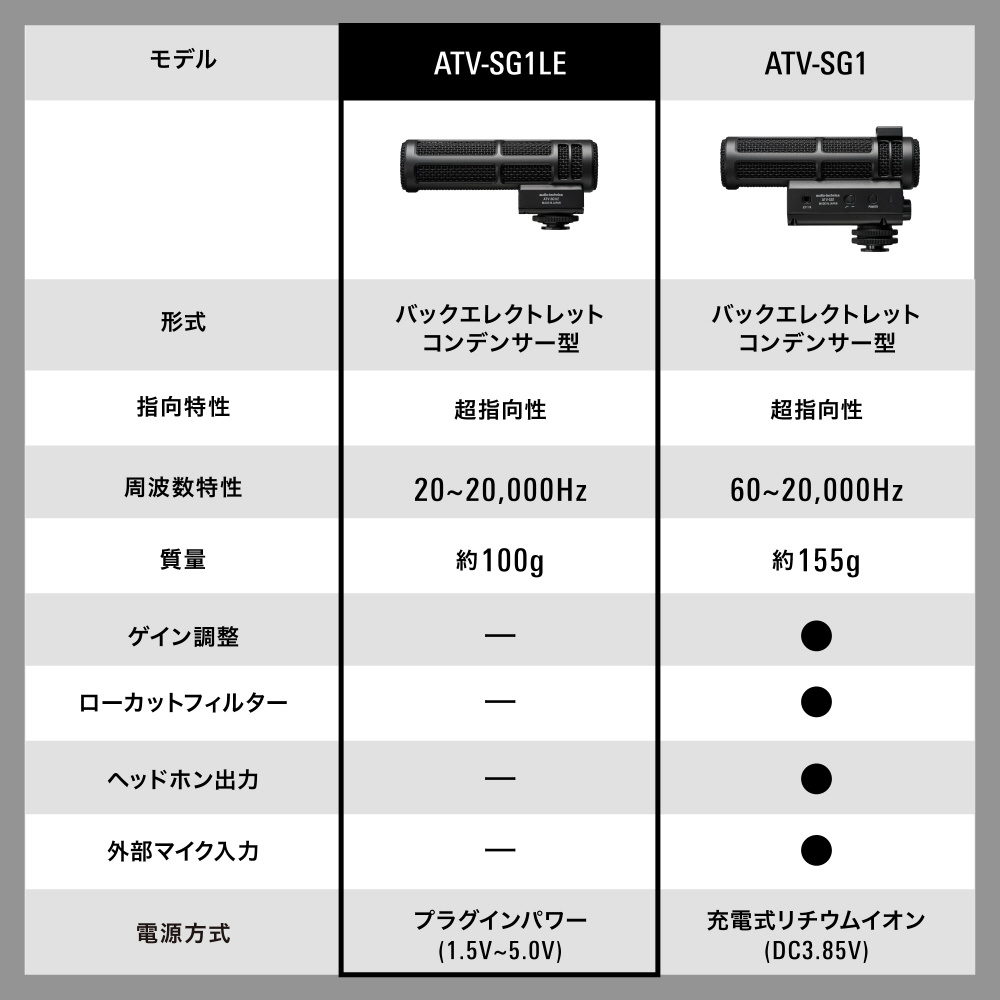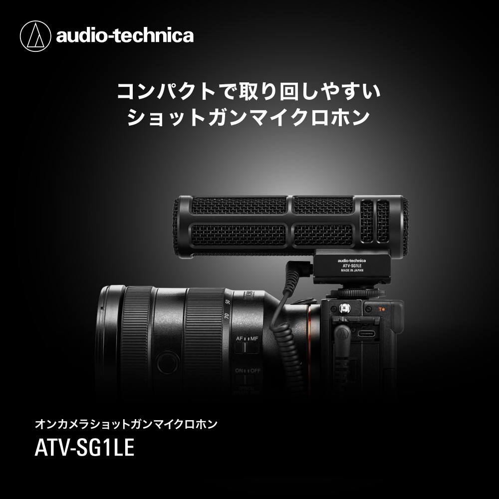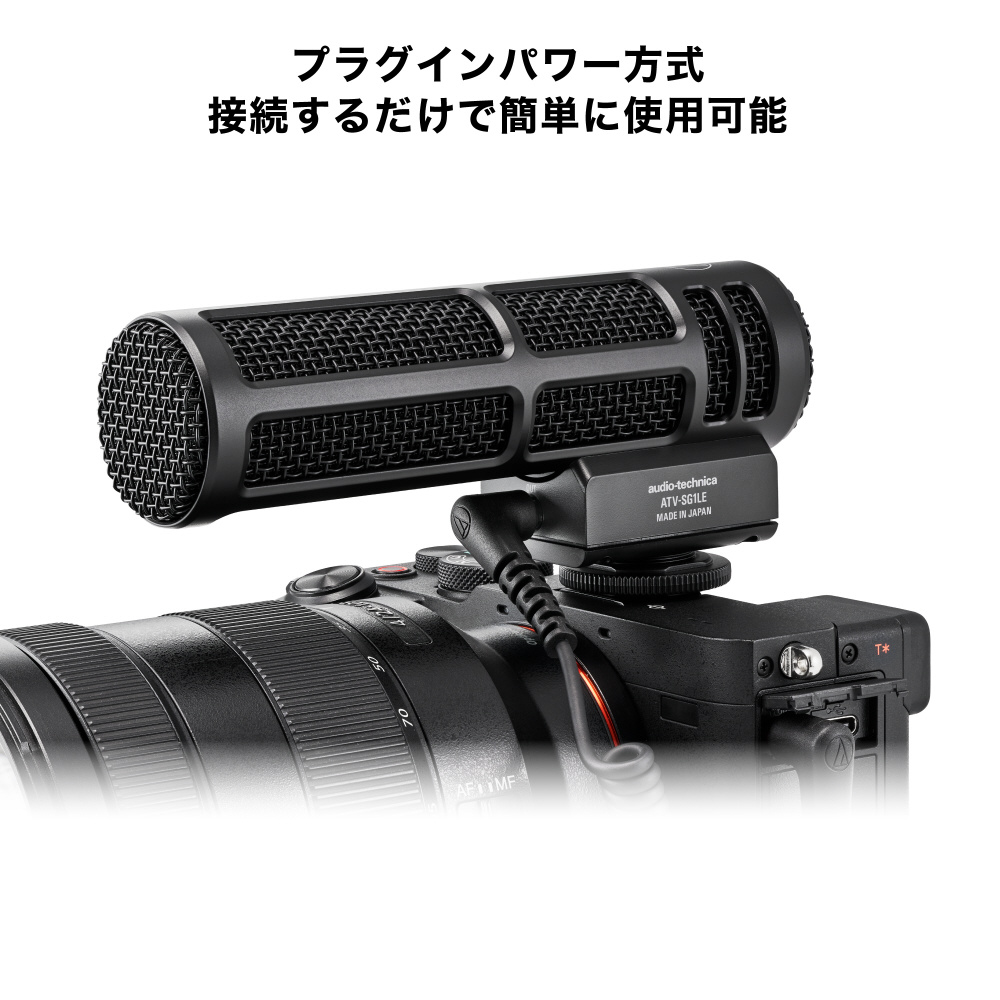 『ATV-SG1LE』は、コンテンツクリエイターやYouTuber、動画の音声をプロフェッショナルな品質に高めたい全ての方に最適なオンカメラショットガンマイクです。DSLRやミラーレス一眼などのカメラにケーブルを差し込むだけで準備は完了。