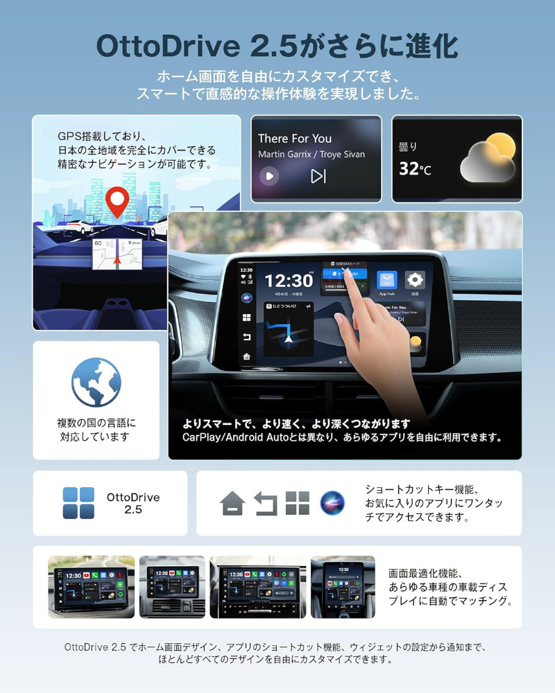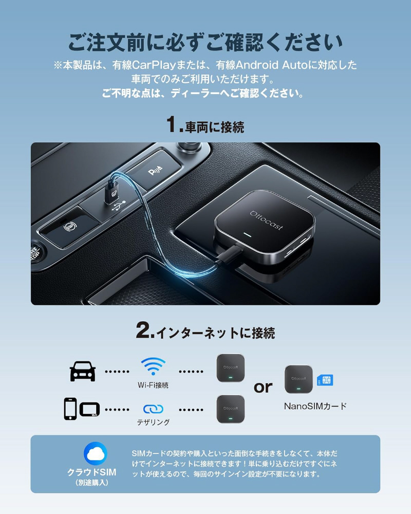 「4GB RAM+64GBストレージ」の高性能チップを搭載し、有線CarPlay/Android Auto搭載車をワイヤレス化し、車内をスマート空間へ進化させる次世代デバイス。Android 13とOttoDrive 2.5搭載で、ナビ・音楽・動画・通話・アプリを快適操作。USBに挿すだけの簡単セットアップで、すぐに使えます。 クラウドSIM対応で常時オンライン。人気アプリも自由に楽しめます。 「挿すだけ」で、あなたのクルマがスマート化。