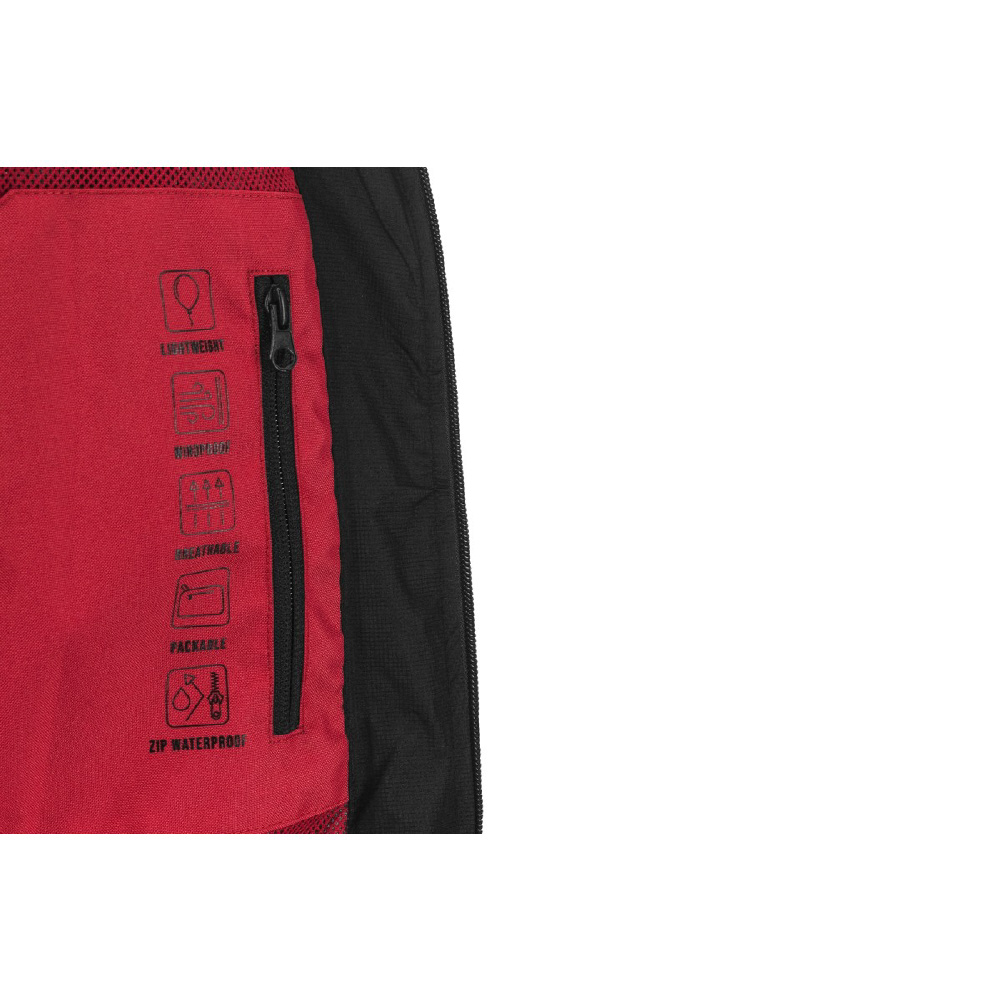 アクラポビッチ製のオフィシャルフード付きレインジャケットです。耐水圧10,000mmでありながら透湿効果も備えられ、雨・雪の日でも快適な着心地を保ちます。