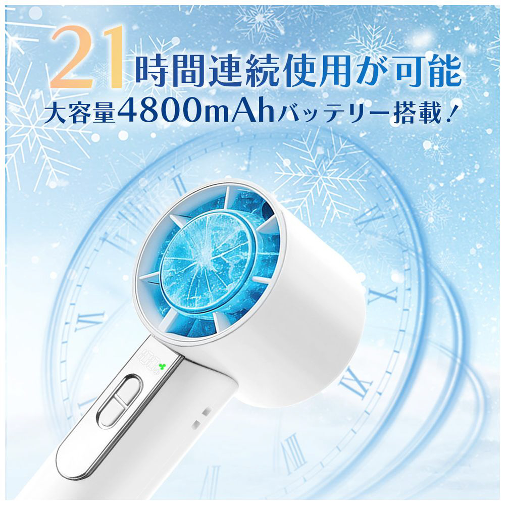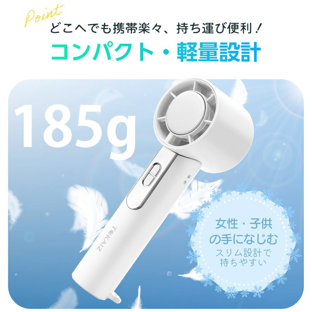 風量と残量が一目でわかるLED表示、最長21時間使える大容量バッテリー、わずか185gの軽量設計で持ち運びもラクラク!