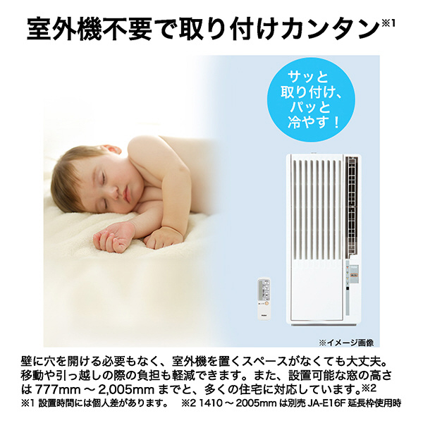 壁に穴を開ける必要もなく、室外機を置くスペースがなくても大丈夫。移動や引っ越しの際の負担も軽減できます。また、設置可能な窓の高さは777mm〜2,005mmまでと、多くの住宅に対応しています※2