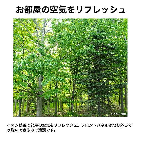 イオン効果で部屋の空気をリフレッシュ。フロントパネルは取り外して水洗いできるので清潔です。