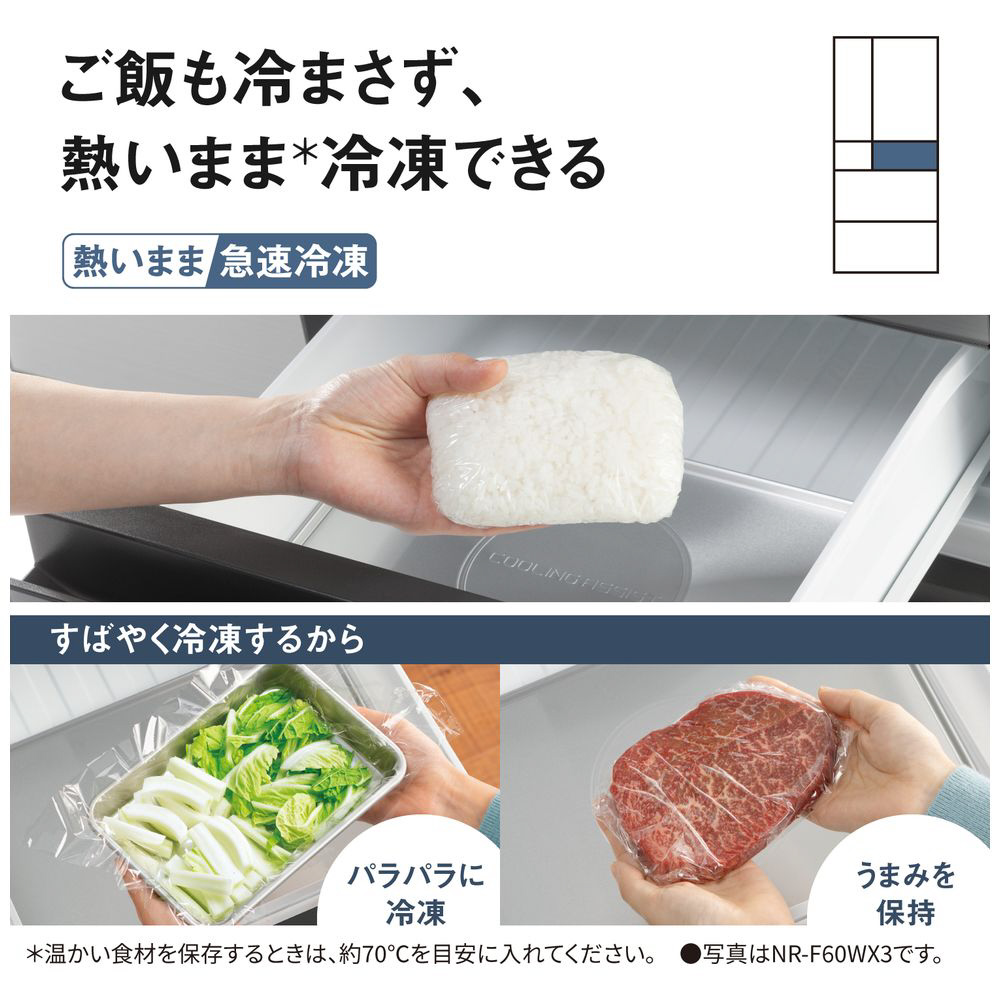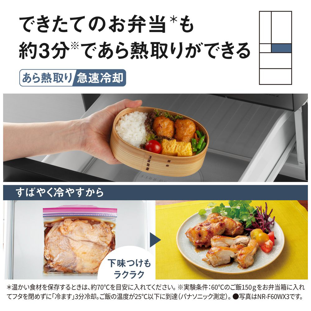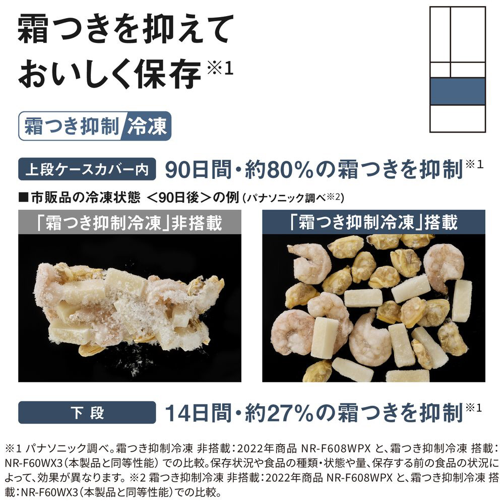 ※2 実験条件:牛ステーキ肉(もも肉)150gをプラスチックパックに入れ、14日間保存。周囲温度25℃、扉開閉なし(パナソニック測定)。試験結果:霜つき抑制運転なし 2022年商品 NR-F608WPX 冷凍室下段、霜つき抑制運転あり NR-F60WX3(本製品と同等性能)冷凍室下段で保存の比較。霜量 NR-F608WPX:2.45g、NR-F60WX3:1.68g。