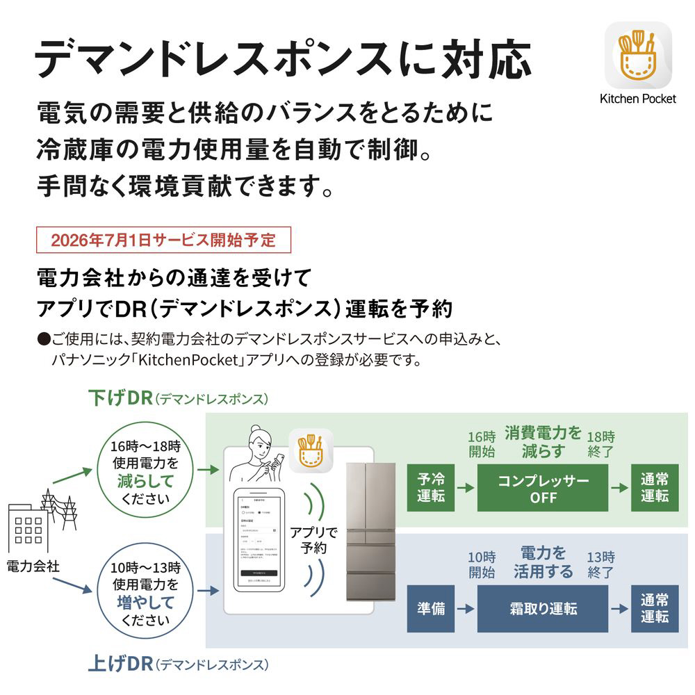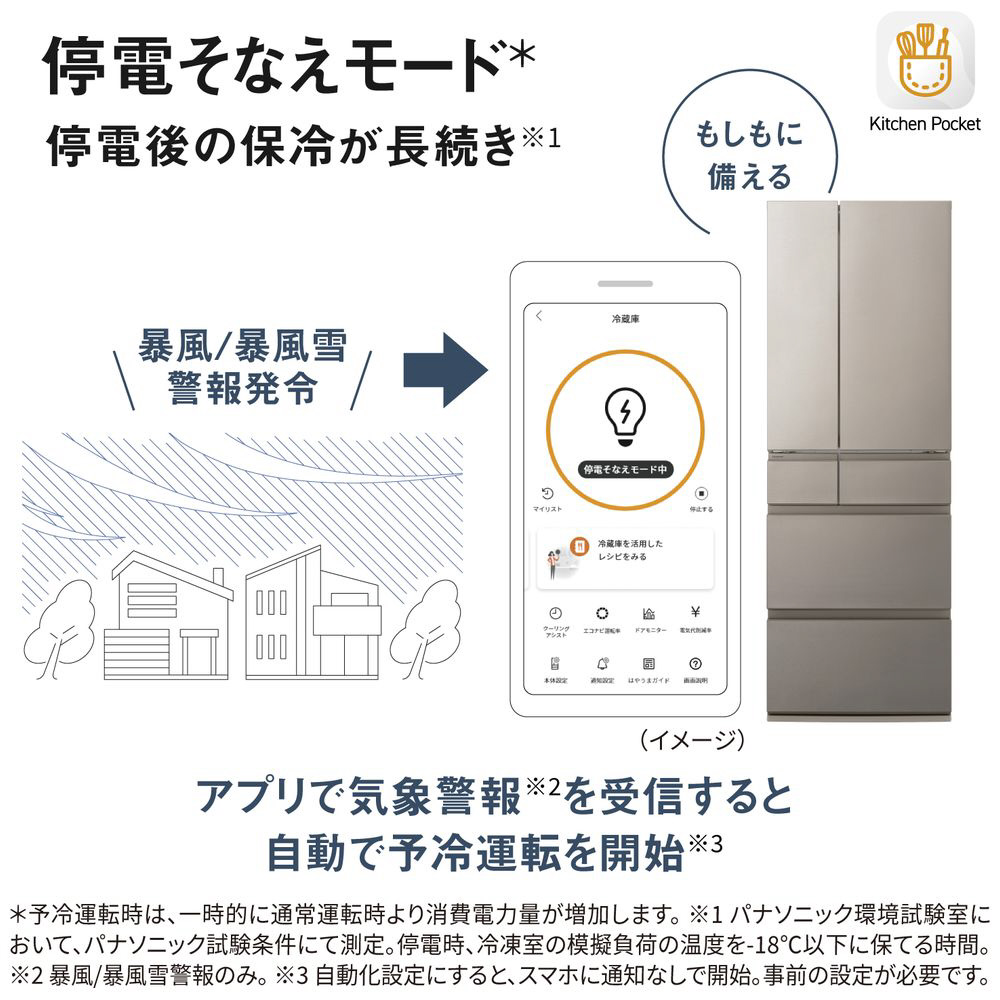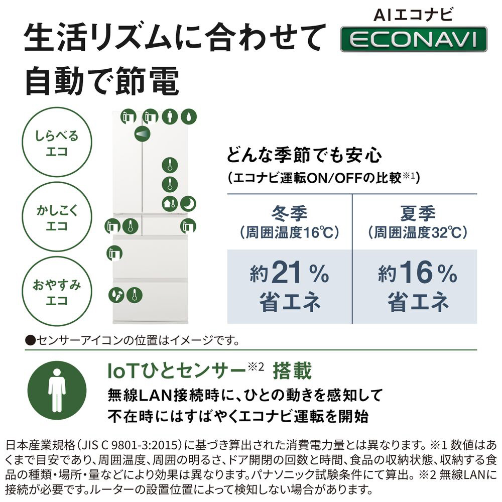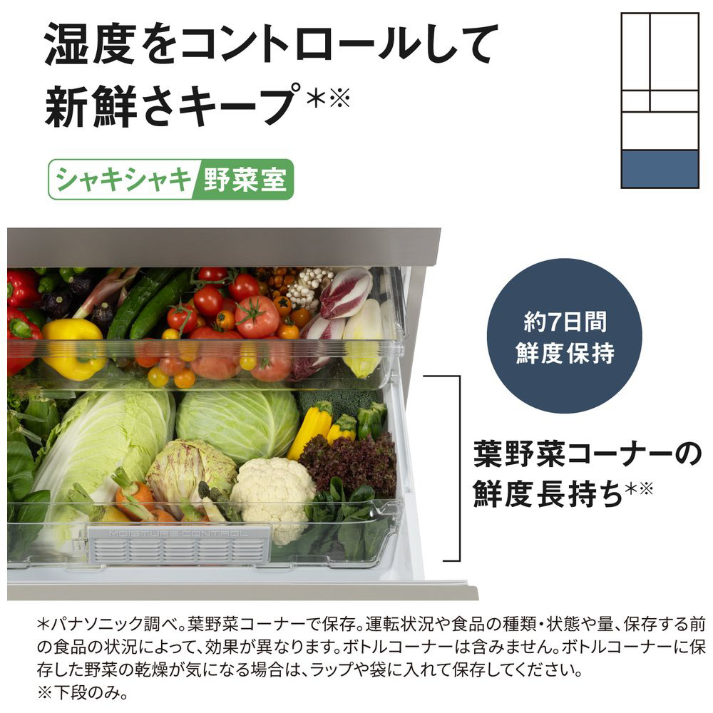 ※2 実験条件:牛ステーキ肉(もも肉)150gをプラスチックパックに入れ、14日間保存。周囲温度25℃、扉開閉なし(パナソニック測定)。試験結果:霜つき抑制運転なし 2022年商品 NR-F608WPX 冷凍室下段、霜つき抑制運転あり NR-F60WX3(本製品と同等性能)冷凍室下段で保存の比較。霜量 NR-F608WPX:2.45g、NR-F60WX3:1.68g。