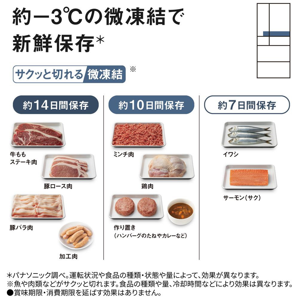※1 実験条件:牛ステーキ肉(もも肉)150gをプラスチックパックに入れ、90日間保存。周囲温度25℃、扉開閉なし(パナソニック測定)。試験結果:霜つき抑制冷凍 非搭載 2022年商品 NR-F608WPX、霜つき抑制冷凍 搭載 NR-F60WX3(本製品と同等性能)で保存の比較。霜量 NR-F608WPX:10.85g、NR-F60WX3:0.99g。