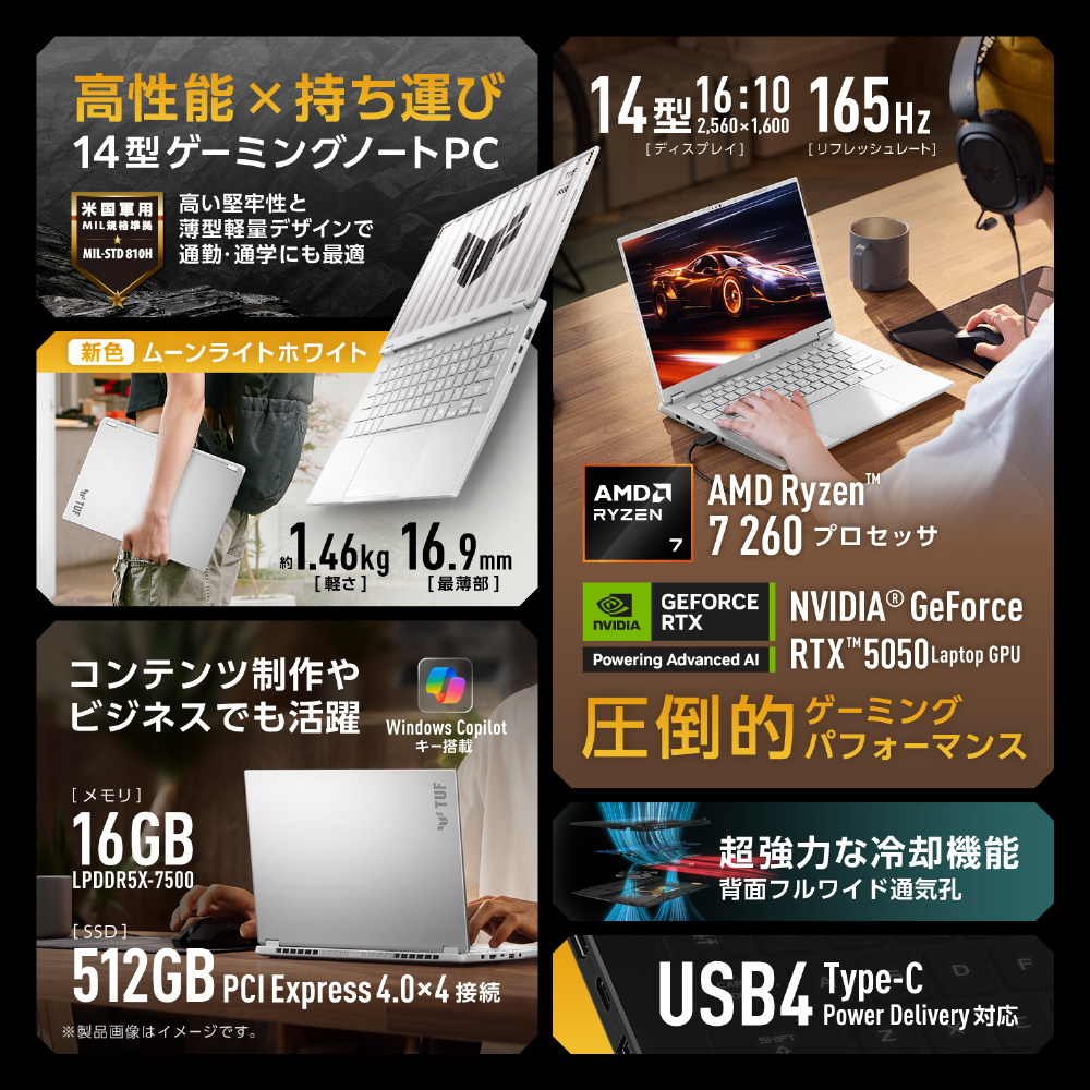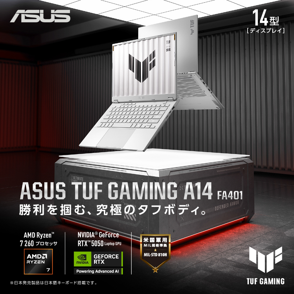 FA401UH-R7R505016GW ゲーミングノートパソコン TUF Gaming A14(RTX 5050) ムーンライトホワイト [14.0型 /Windows11 Home /AMD Ryzen 7 /メモリ:16GB /SSD:512GB /無し /日本語版キーボード /2026年4月モデル]